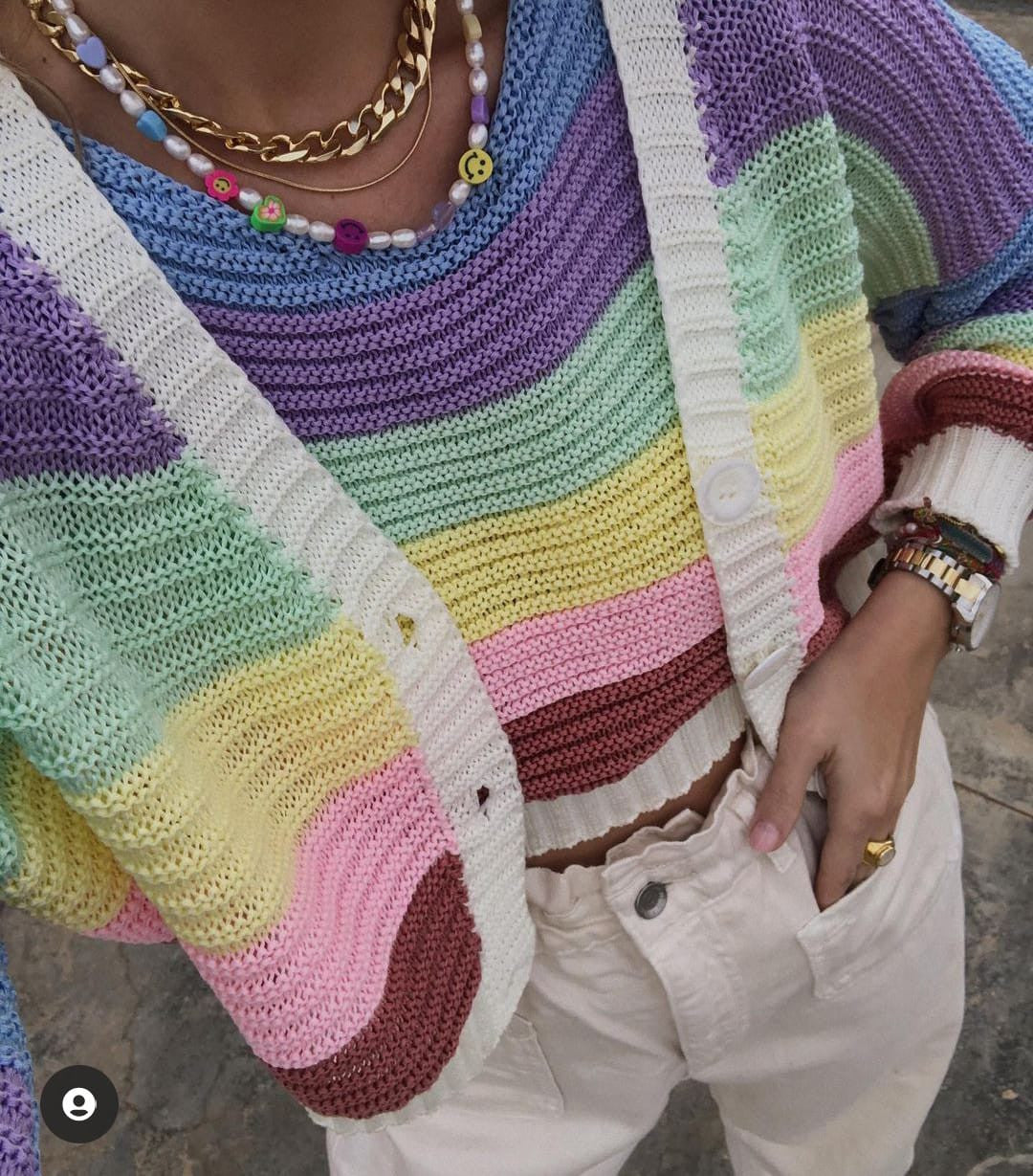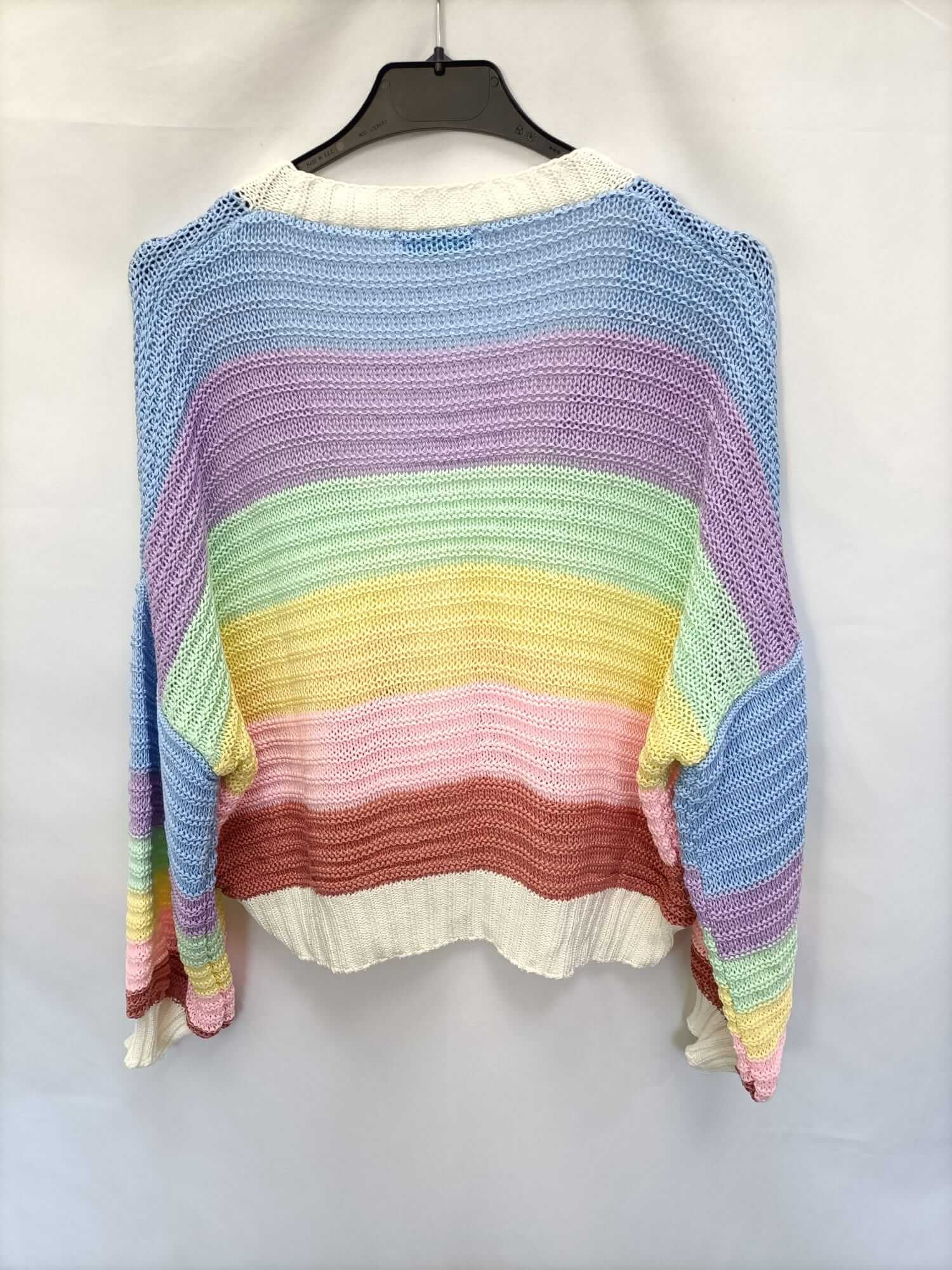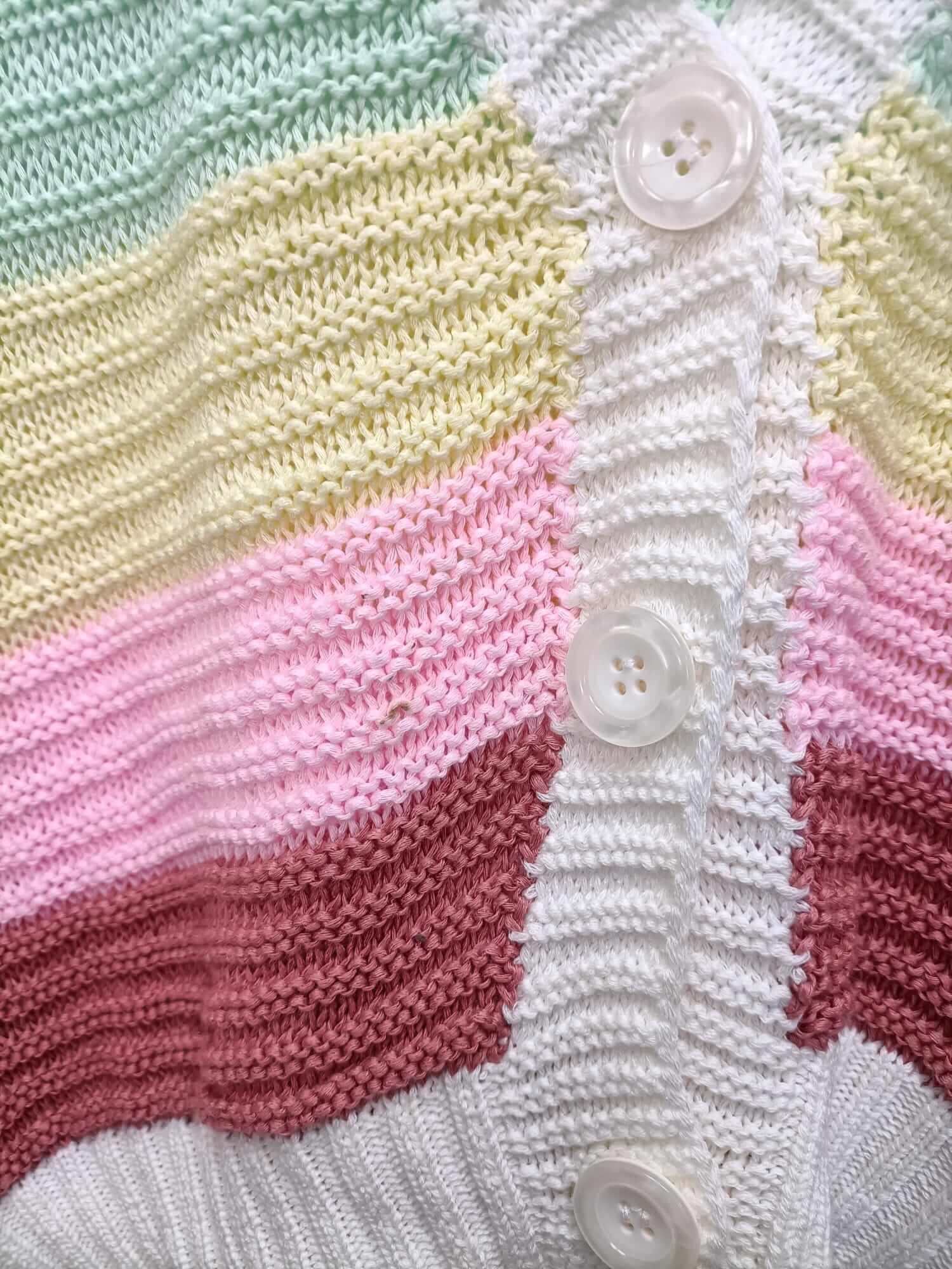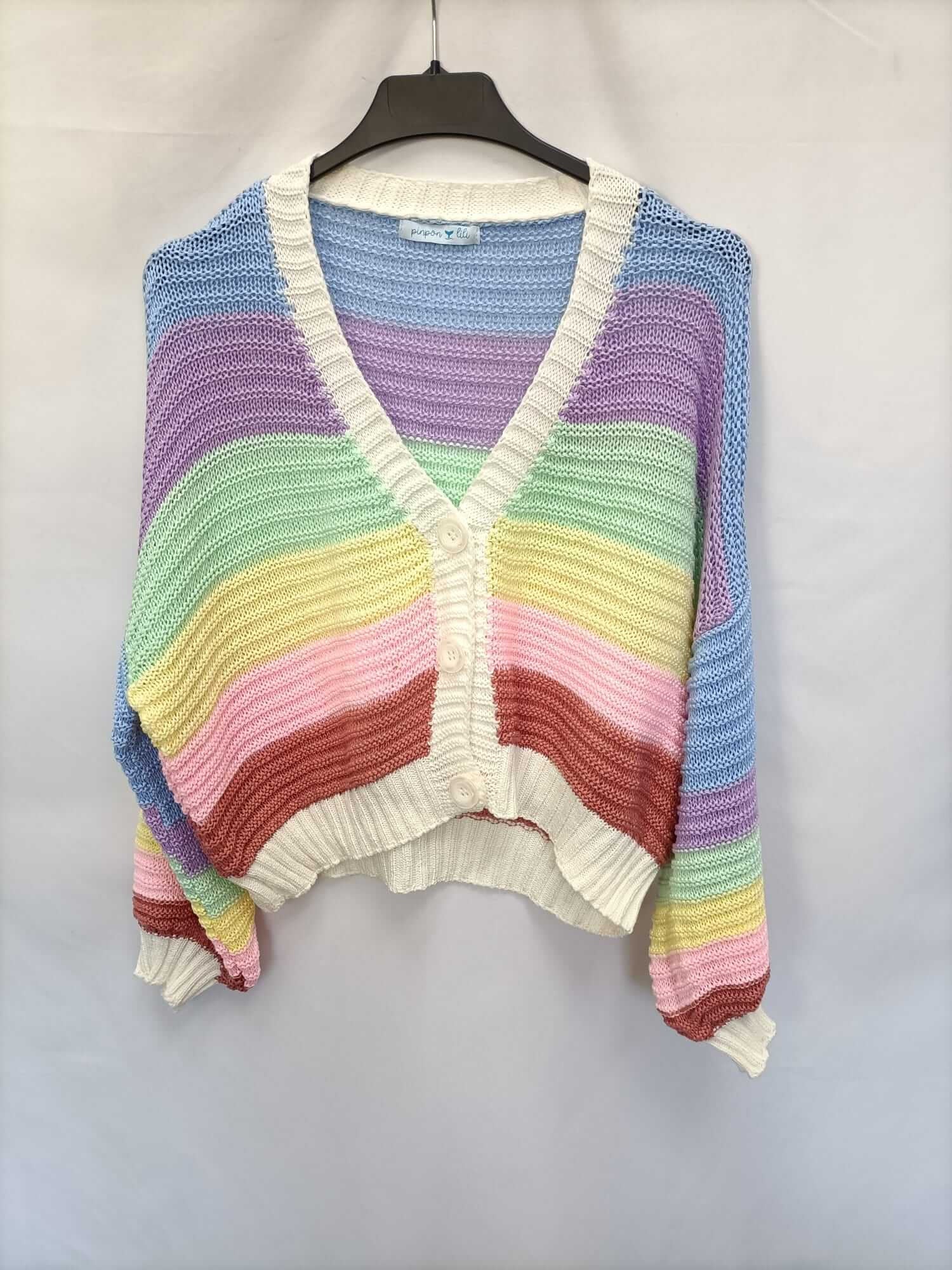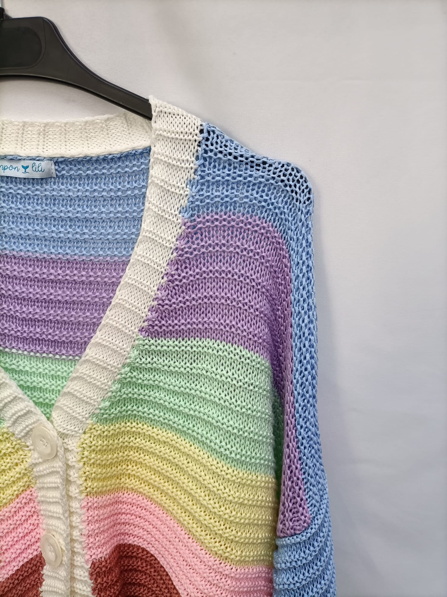 Pimpom Lili. Tu (s/m). Rebeca de punto de colores Abotonada. Fluida y elastica. Largo 51 cm. Mini tara: manchita delantera