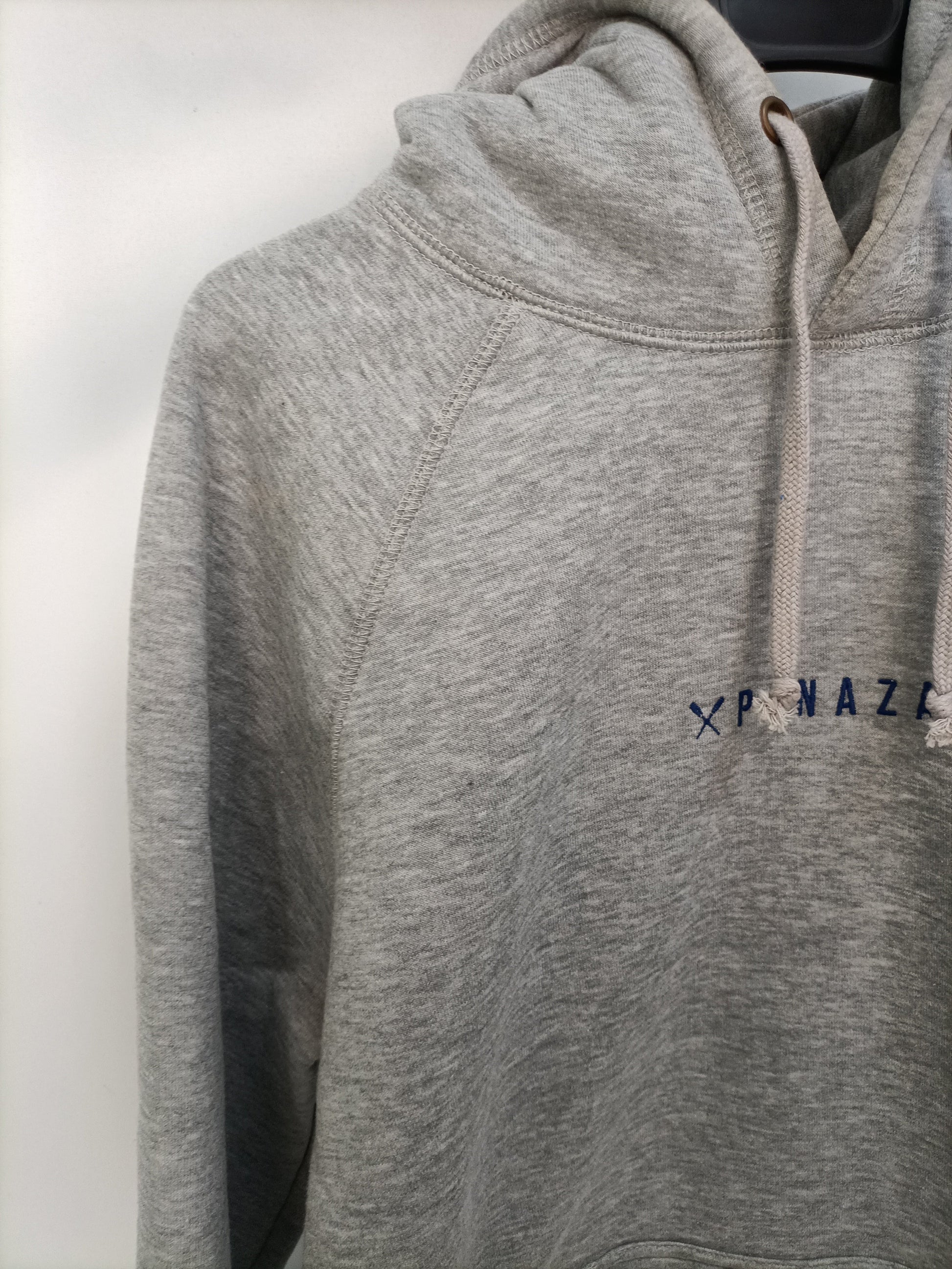 Sudadera gris jaspeada con capucha. Interior de forro polar. Largo 72 cm.