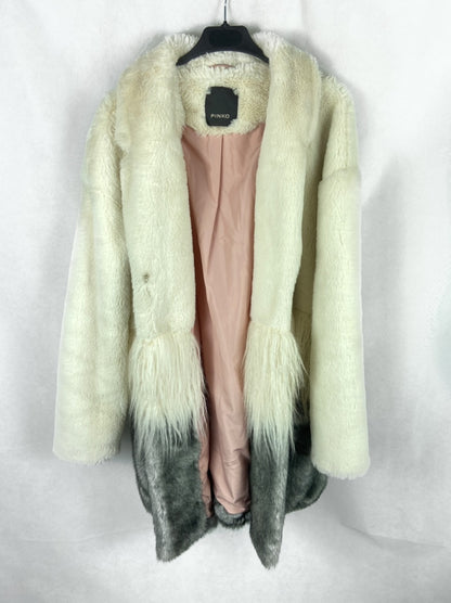Abrigo pelo sintético bicolor. Tiene un par de corchetes para abrochar. De sisa a sisa 60 cm largo 94 cm. Dos enganches para abrochar.