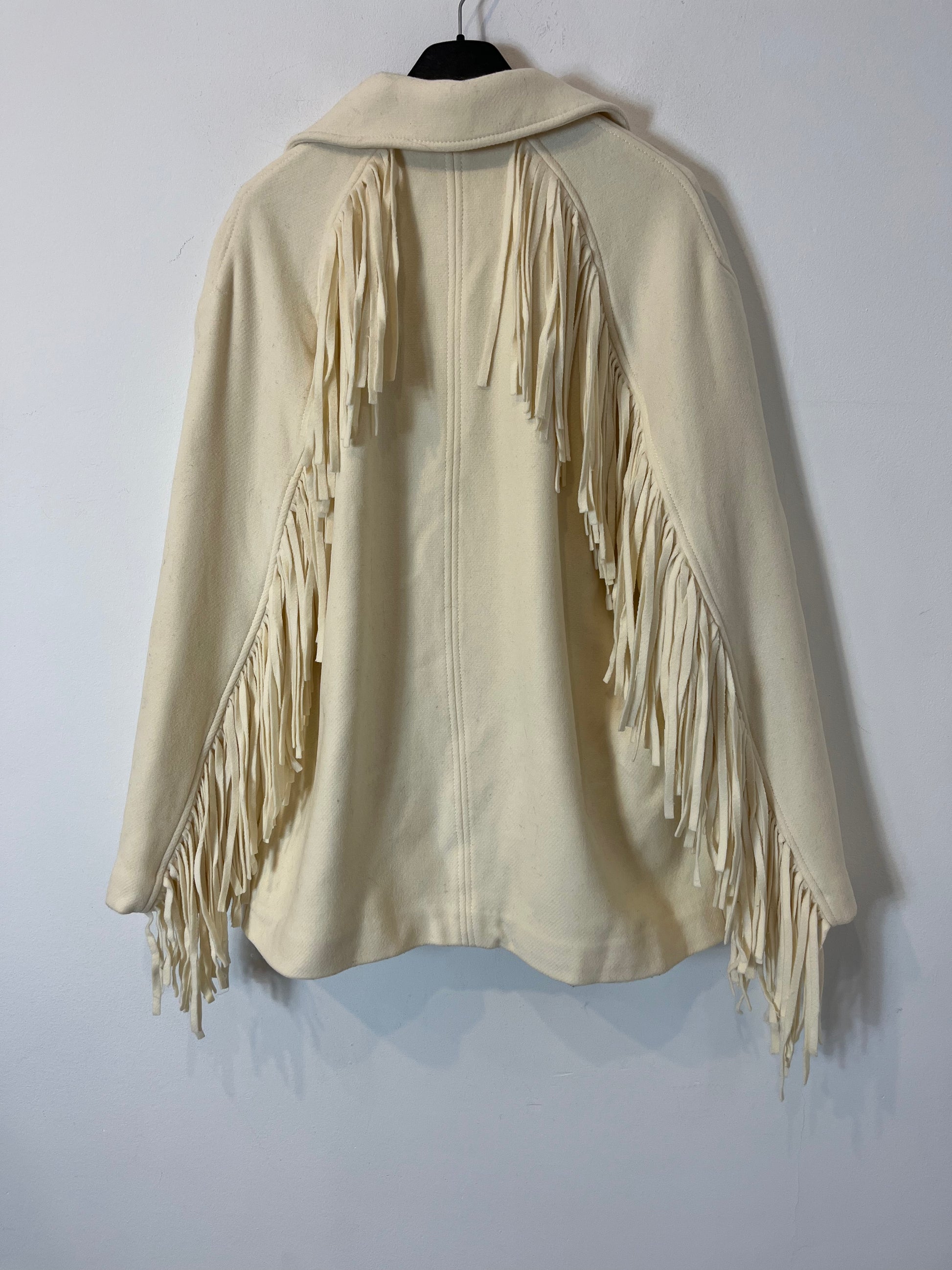 Chaqueta lana flecos beige claro. De sisa a sisa 55 cm, largo 67 cm
