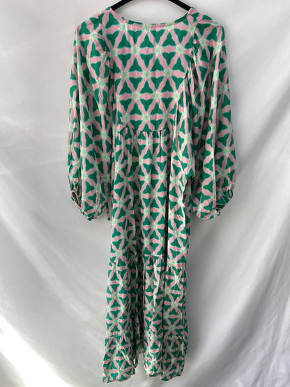 tonos verdes y rosas. Mangas abullonadas. Largo 122 cm