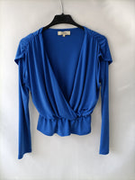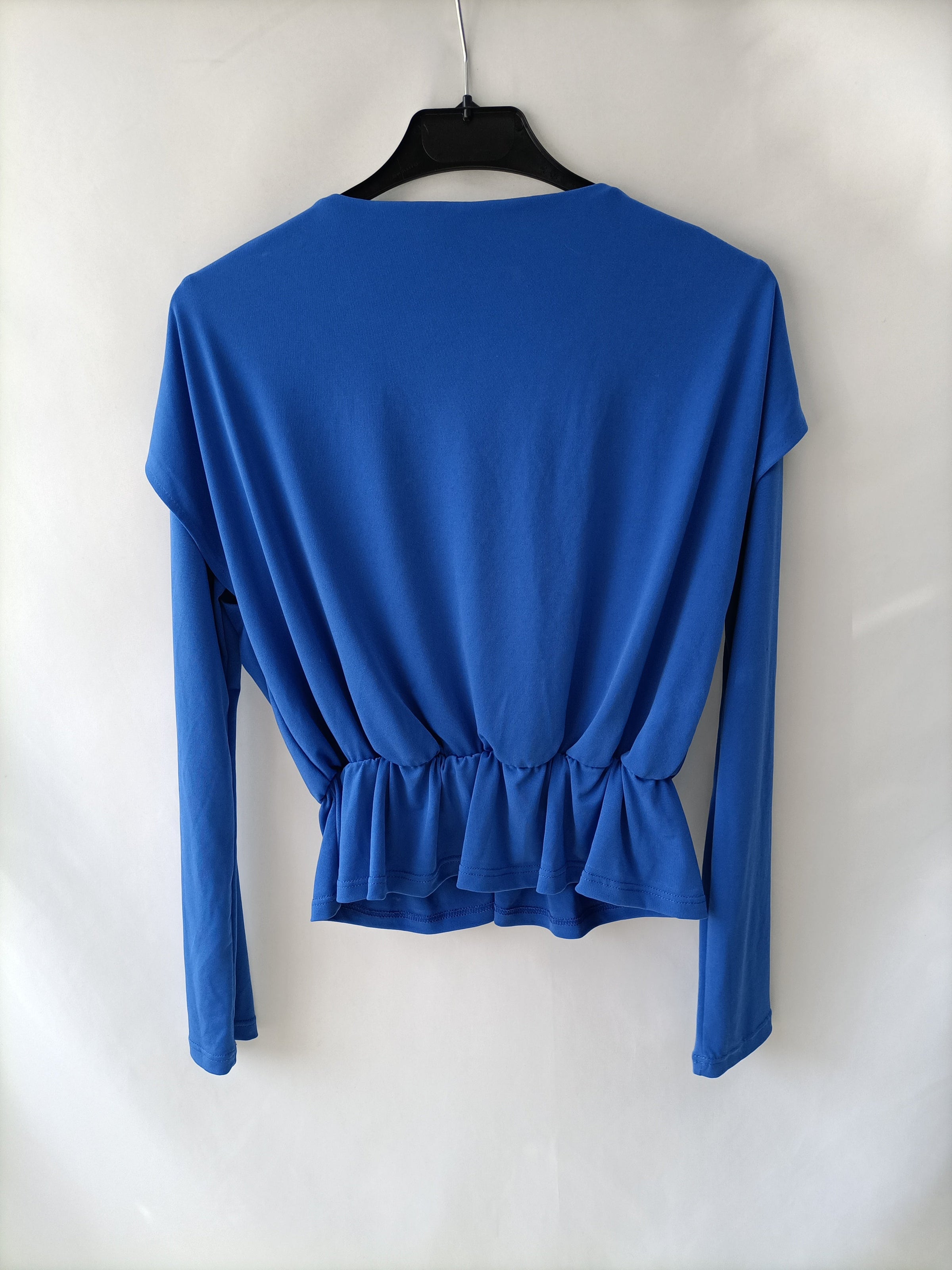 Top azul con escote amplio cruzado. Acabado en volante. Manga larga. Muy elástico. Largo 46 cm