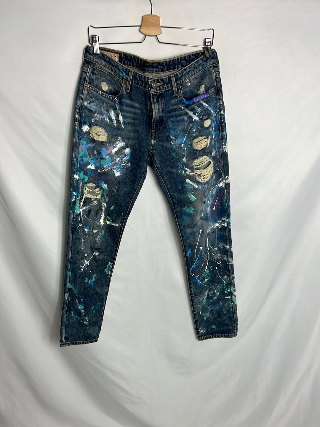 Denim efecto desgasta o pintura. Largo 96cm, cintura 40cm no elástico