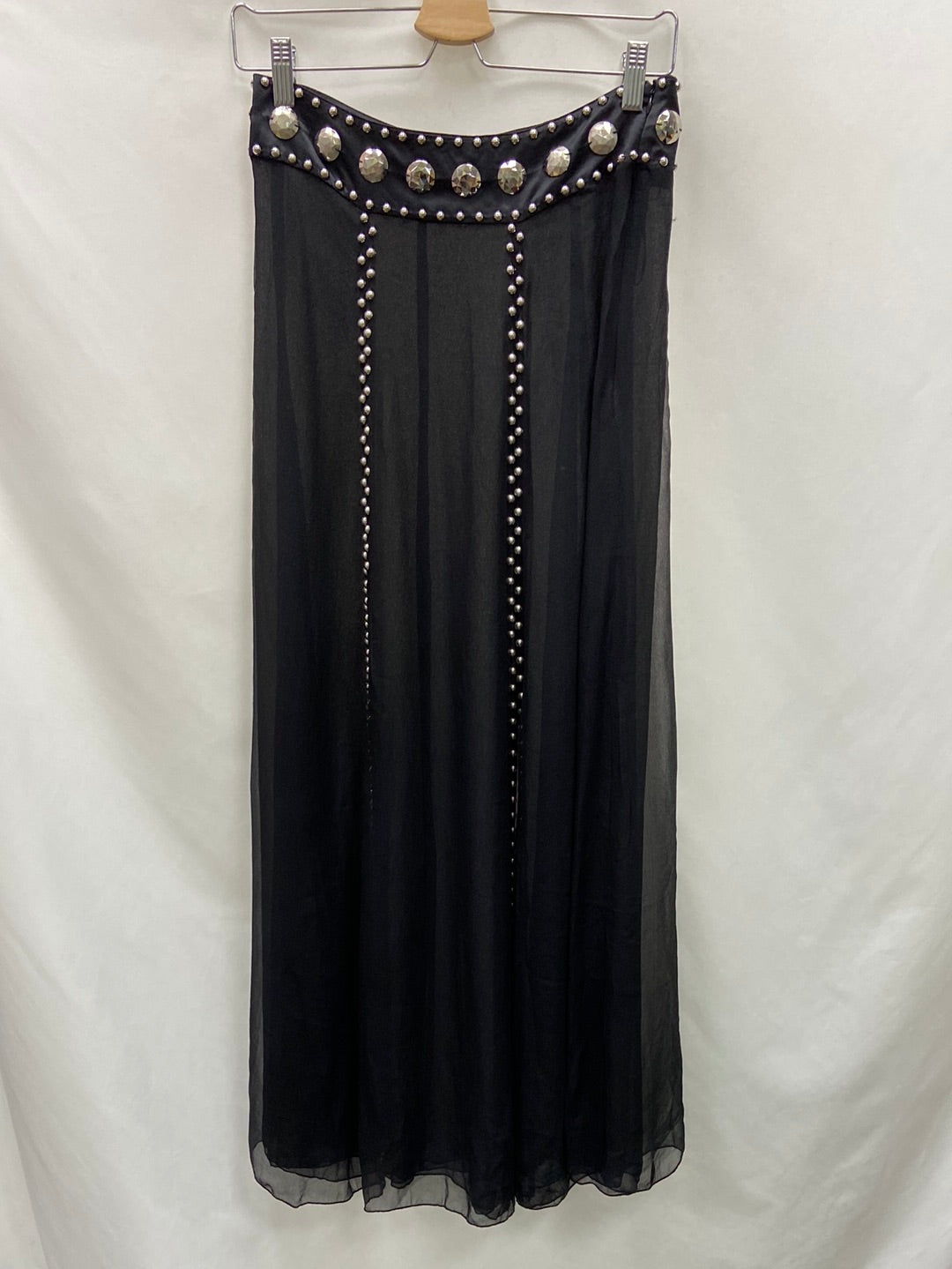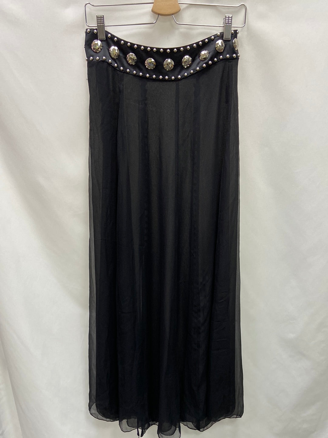 Fañda negra con tachuelas plateadas, seitrasparente. cintura 36 cm Largo 101 Cm.