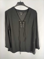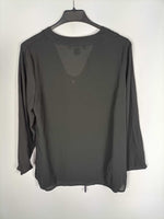 Primark.38. blusa negra fluida y fina con detalle de cuerda en el escote. Semitransparente. De sisa a sisa 48 cm largo 68 cm