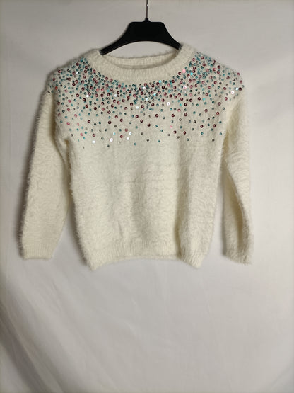 PRIMARK. Jersey blanco lentejuelas T.7-8 años