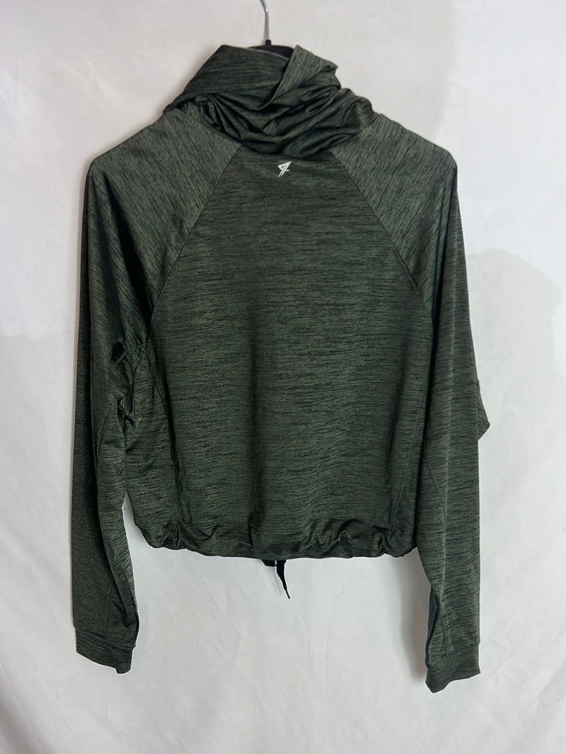 sudadera negra y verde de tejido tipo licra, Ajustable en la cintura. elástica con capucha