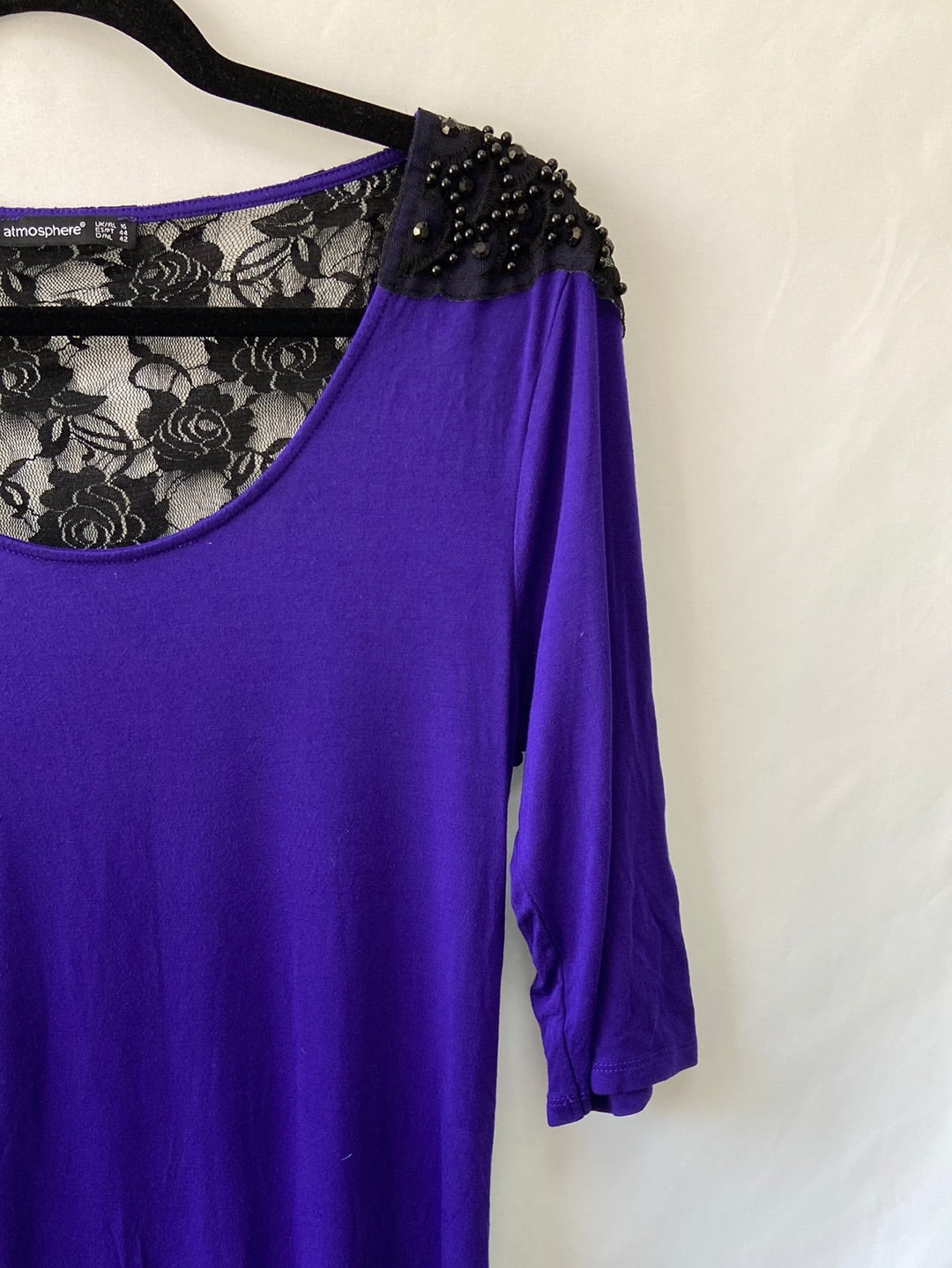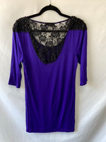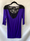 Vestido morado con espalda de encaje y hombros con abalorios. Muy elástico, mangas 3/4. Largo 82 cm