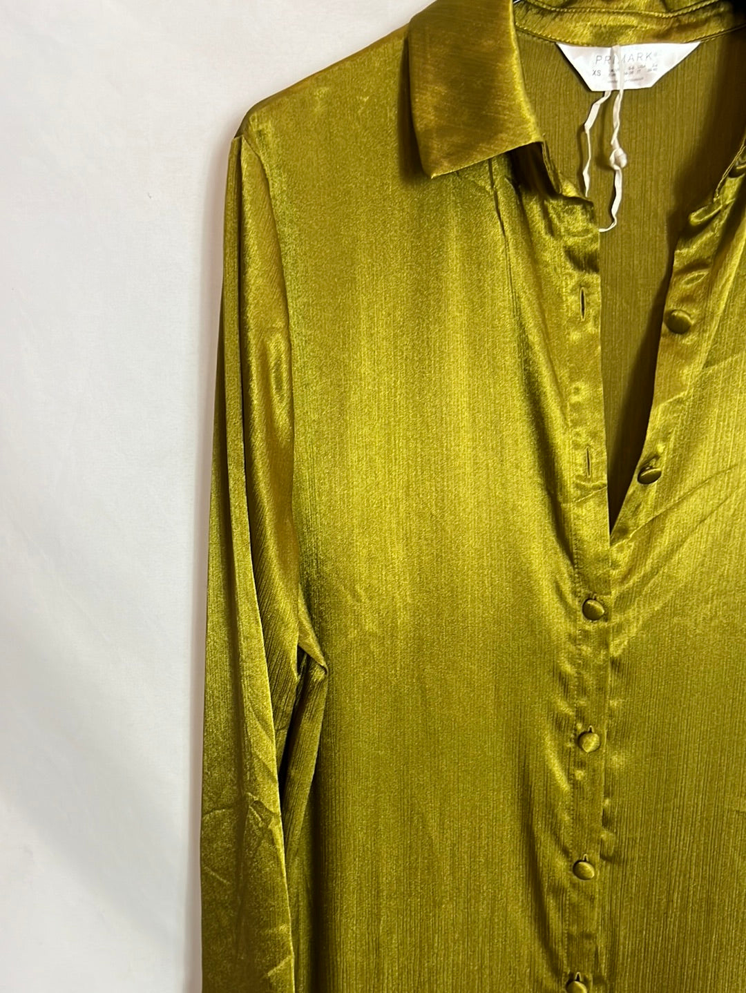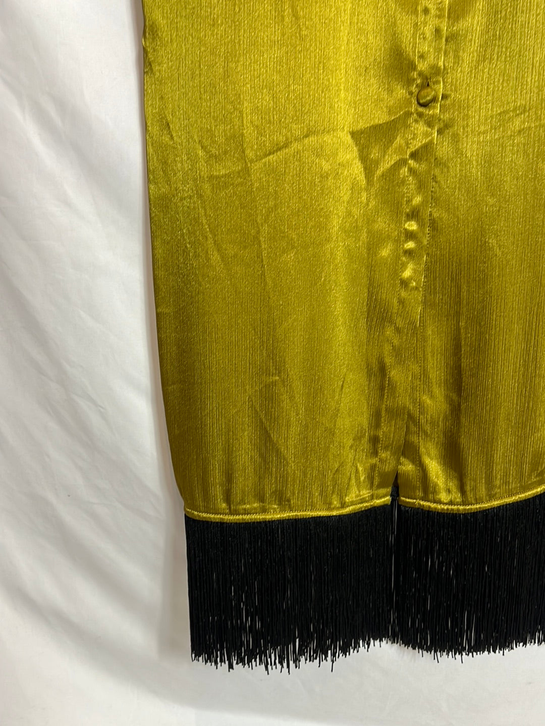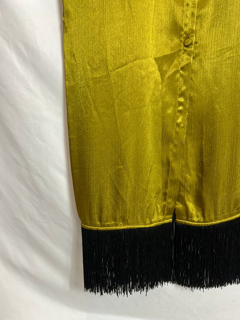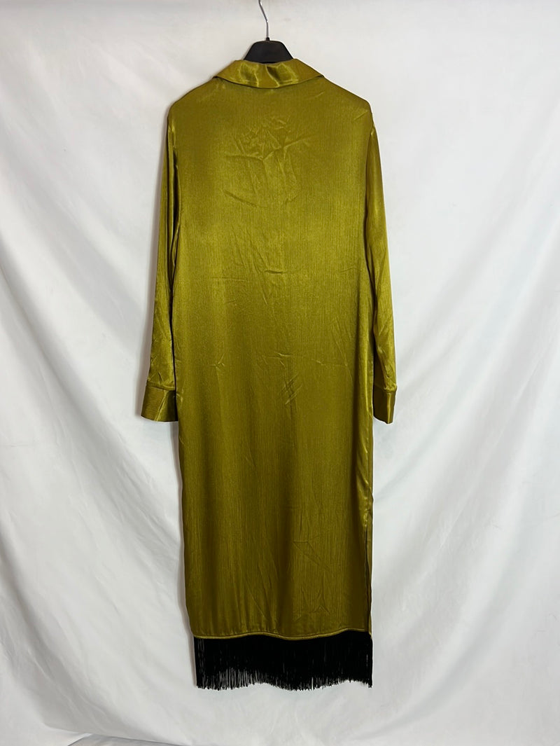 Vestido midi camisero flecos en verde pistacho satinado. Largo 119cm