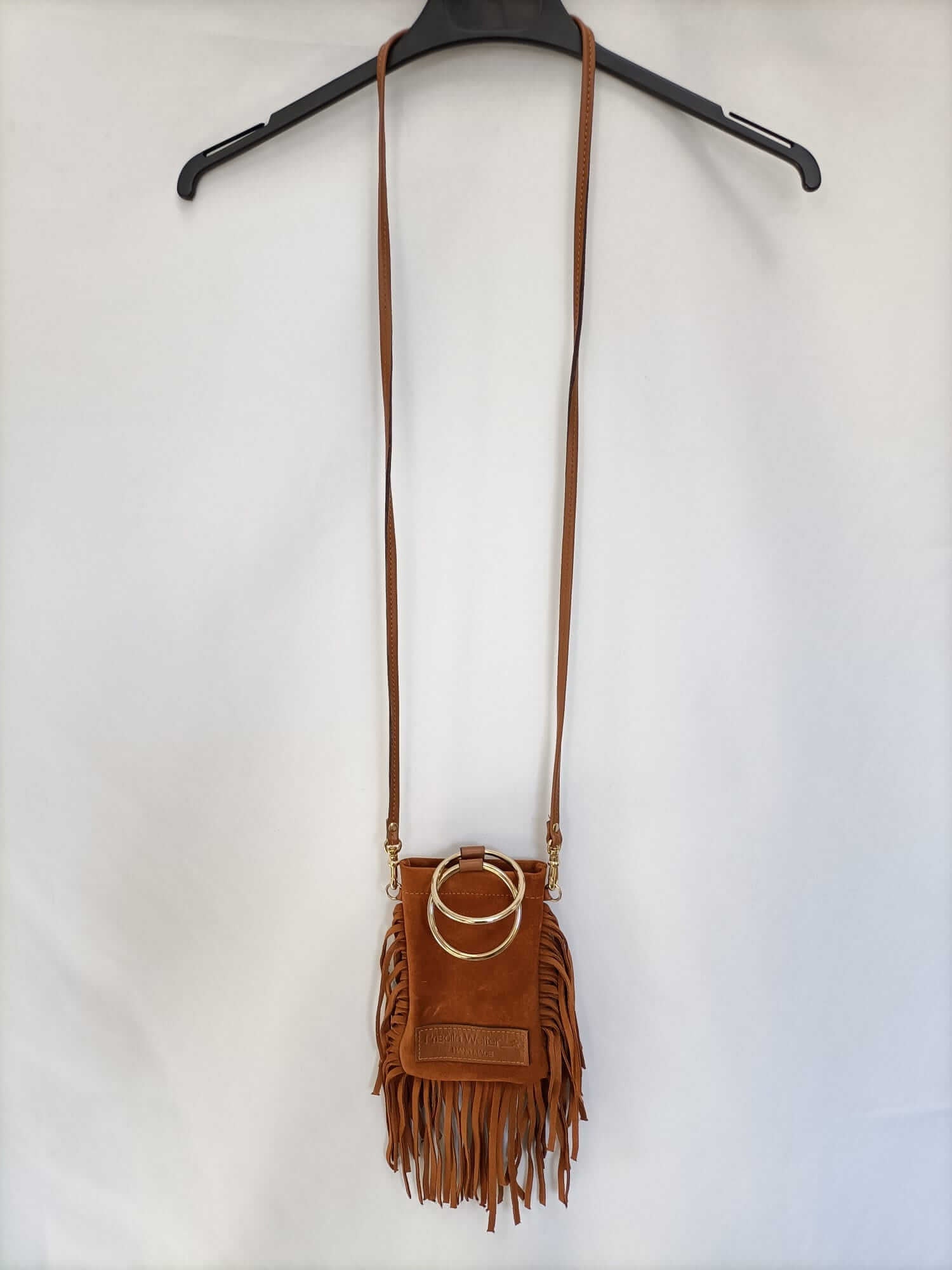 Priscila welter. Mini bolso de piel camel con flecos. Asa larga extraible. 18x10 cm