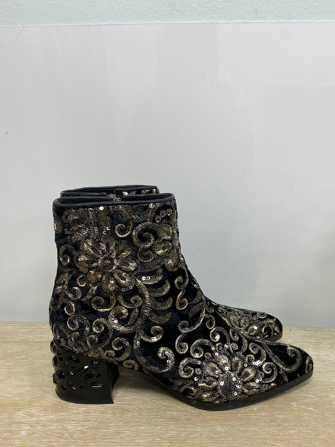 Botines negros, con tacón bajo detalle de lentejuelas y bordados en dorado y pedrería en el tacón