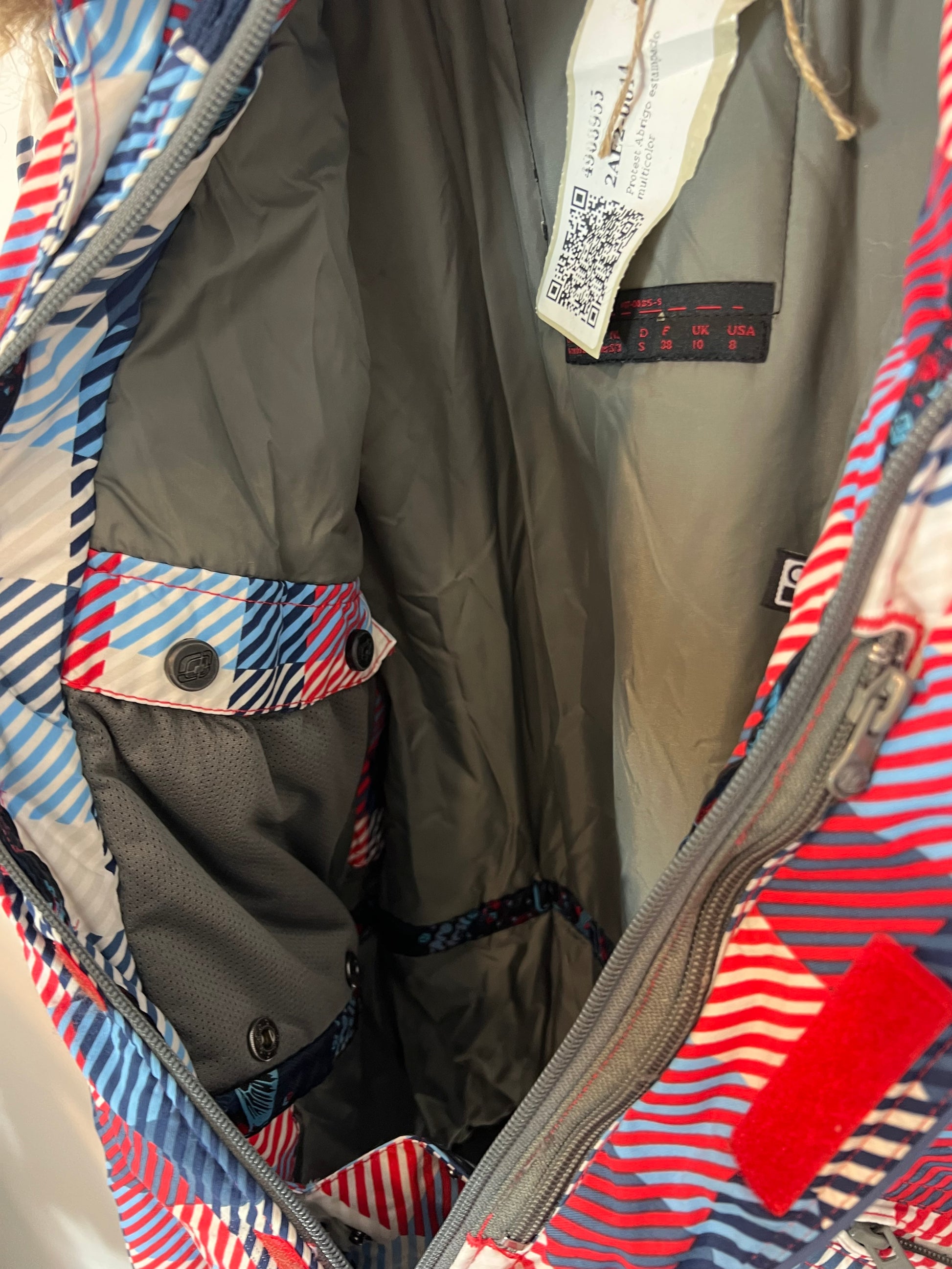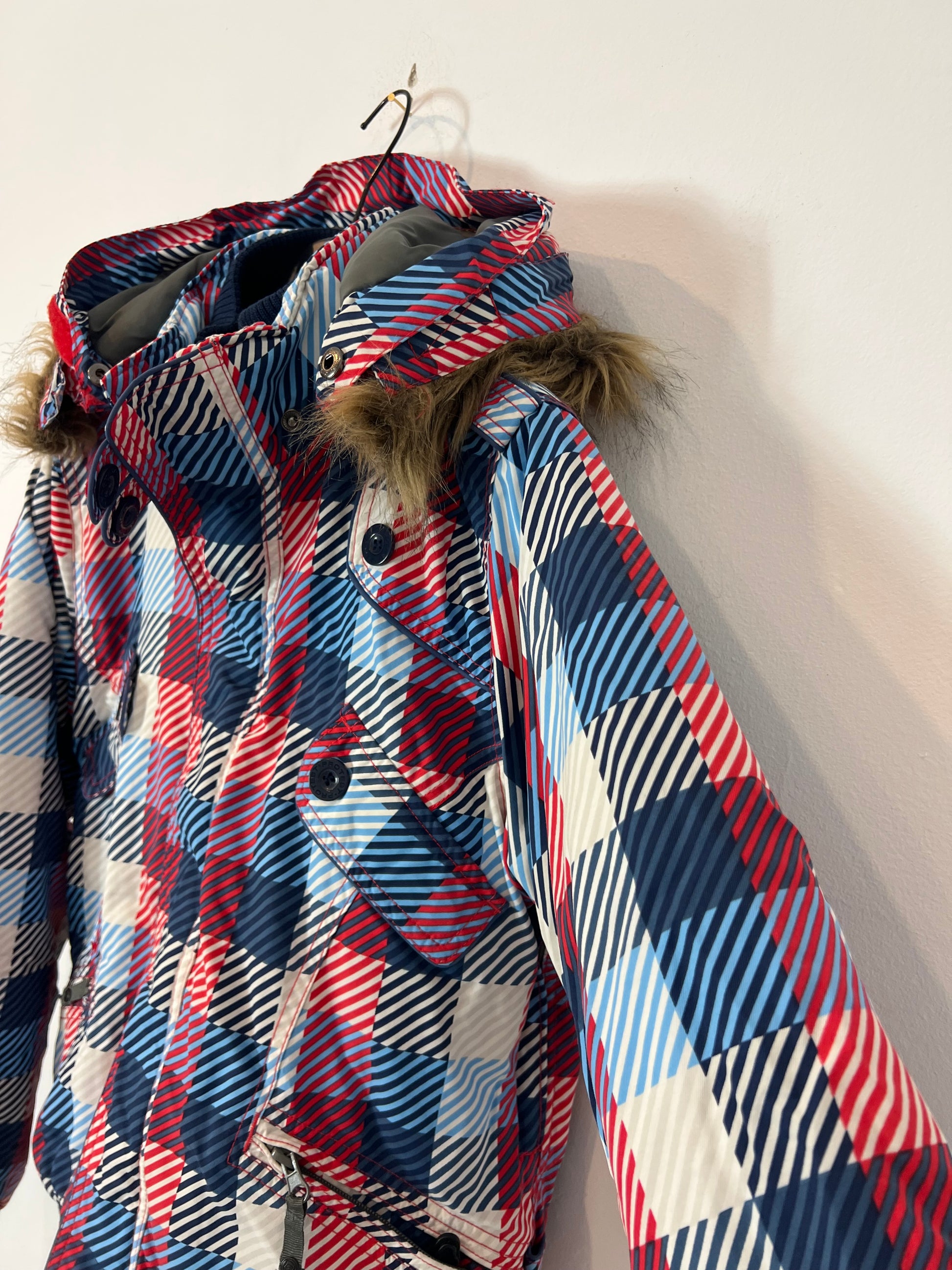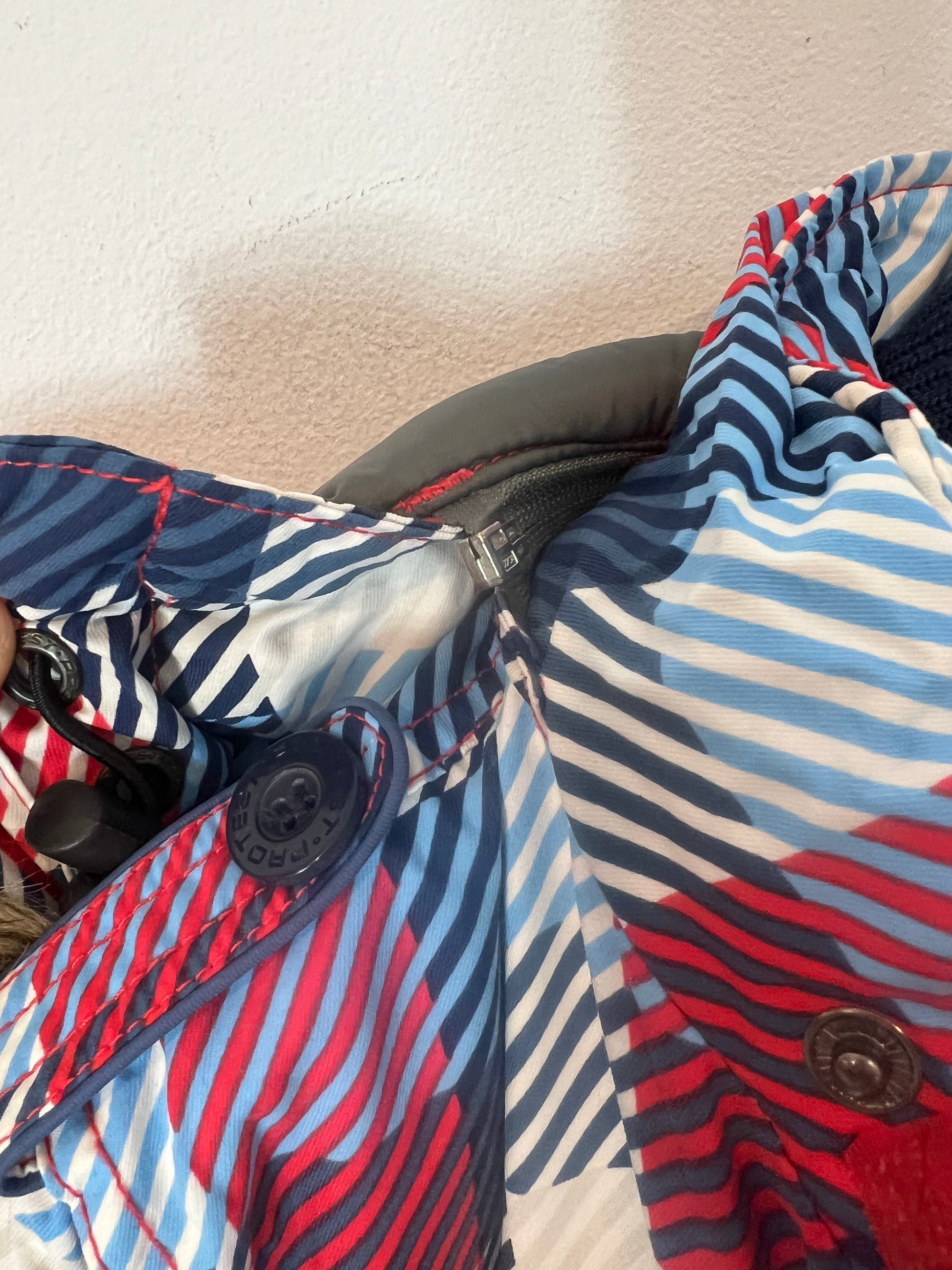 Abrigo de nieve blanco con estampado en azules. Capucha extraíble con detalle de pelo extraíble. De sisa a sisa 51cm, largo 66cm