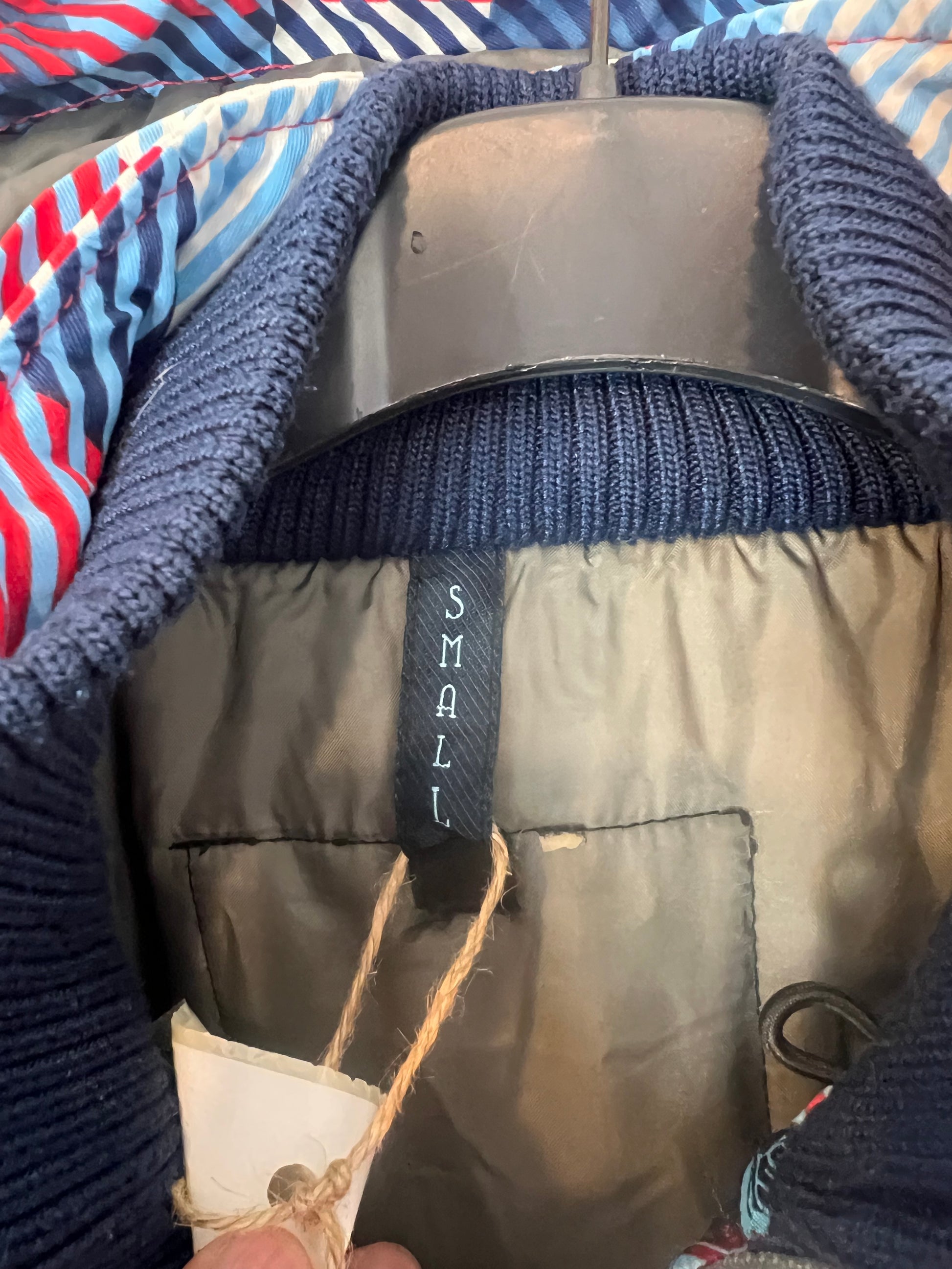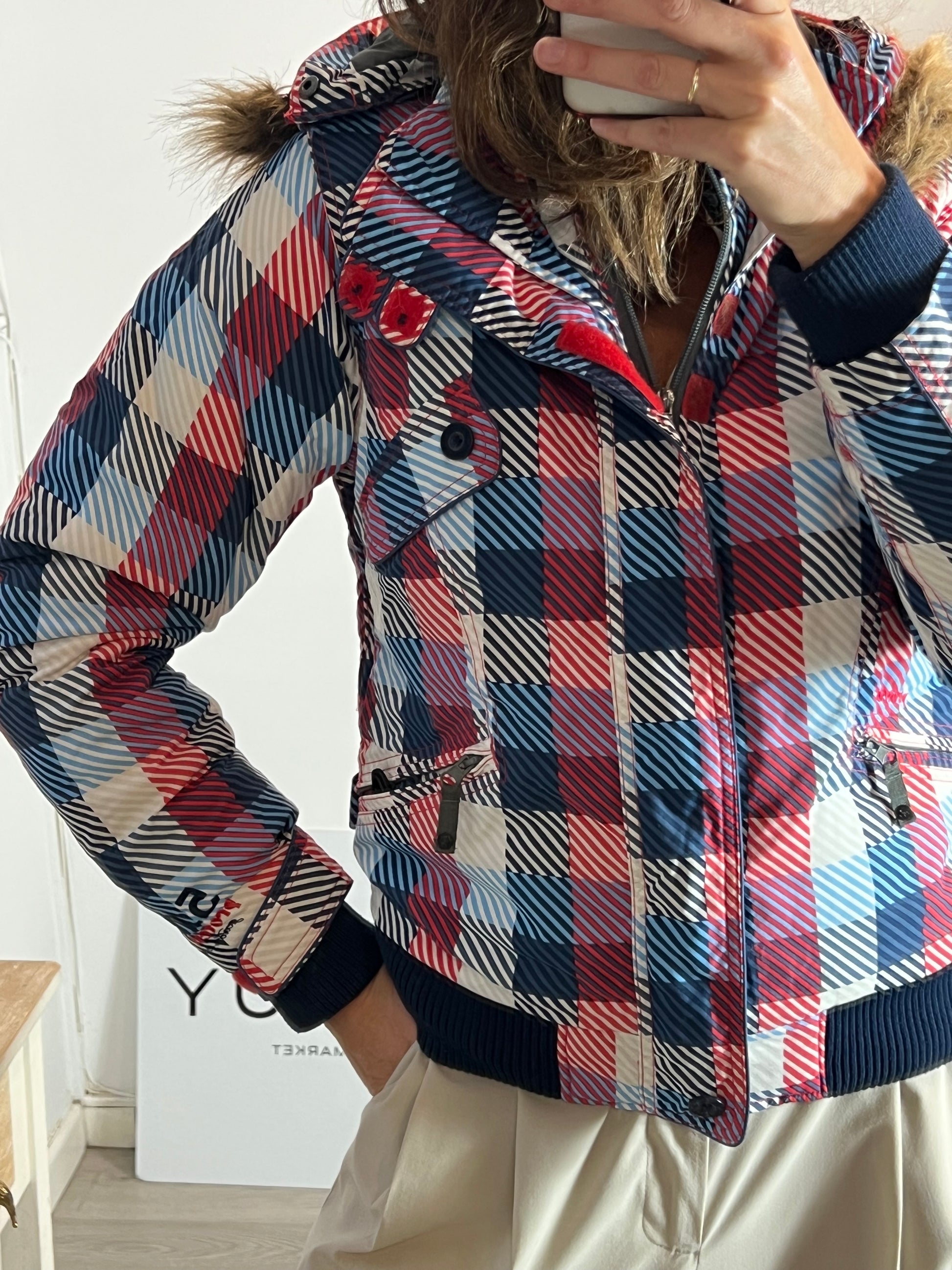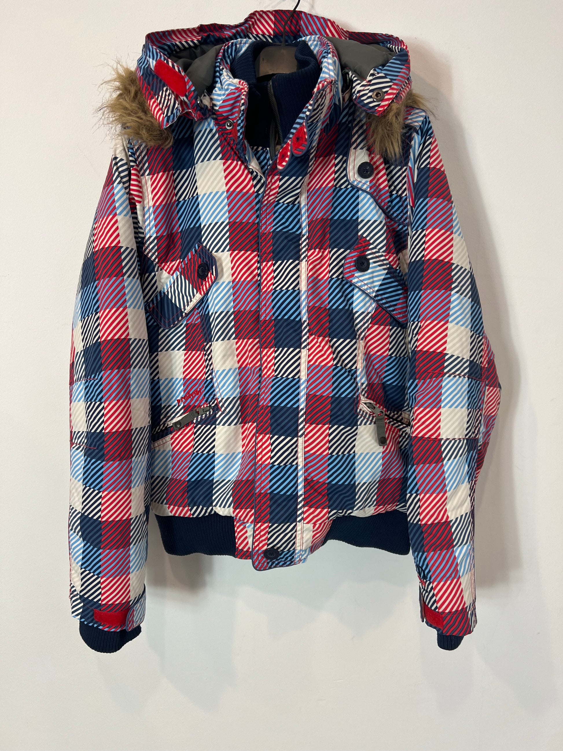 Abrigo de nieve blanco con estampado en azules. Capucha extraíble con detalle de pelo extraíble. De sisa a sisa 51cm, largo 66cm