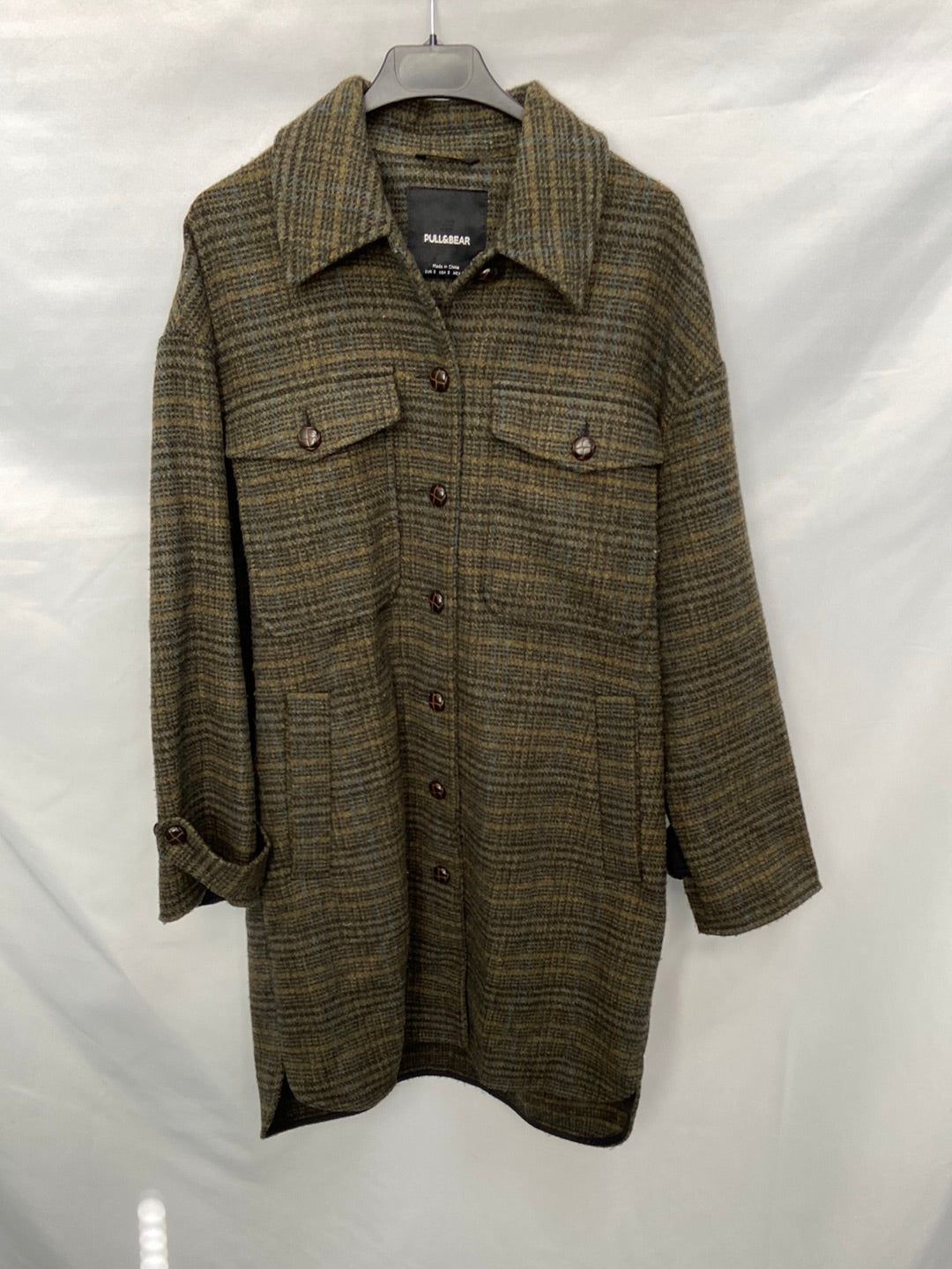Abrigo verde de cuadros estilo pata de gallo abotonado. Largo. oversized. Largo 97 cm.