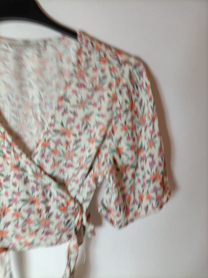 Croptop beige grisaceo con flores. se abrocha con lazada