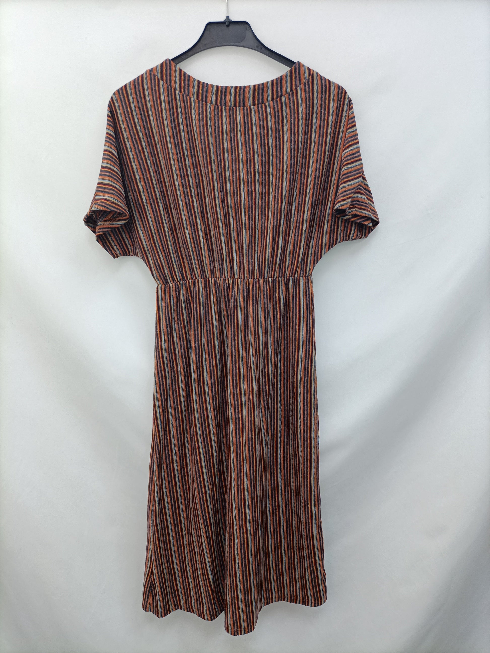 Vestido midi rayas abotonado, escote pico, elástico. Largo 104 cm
