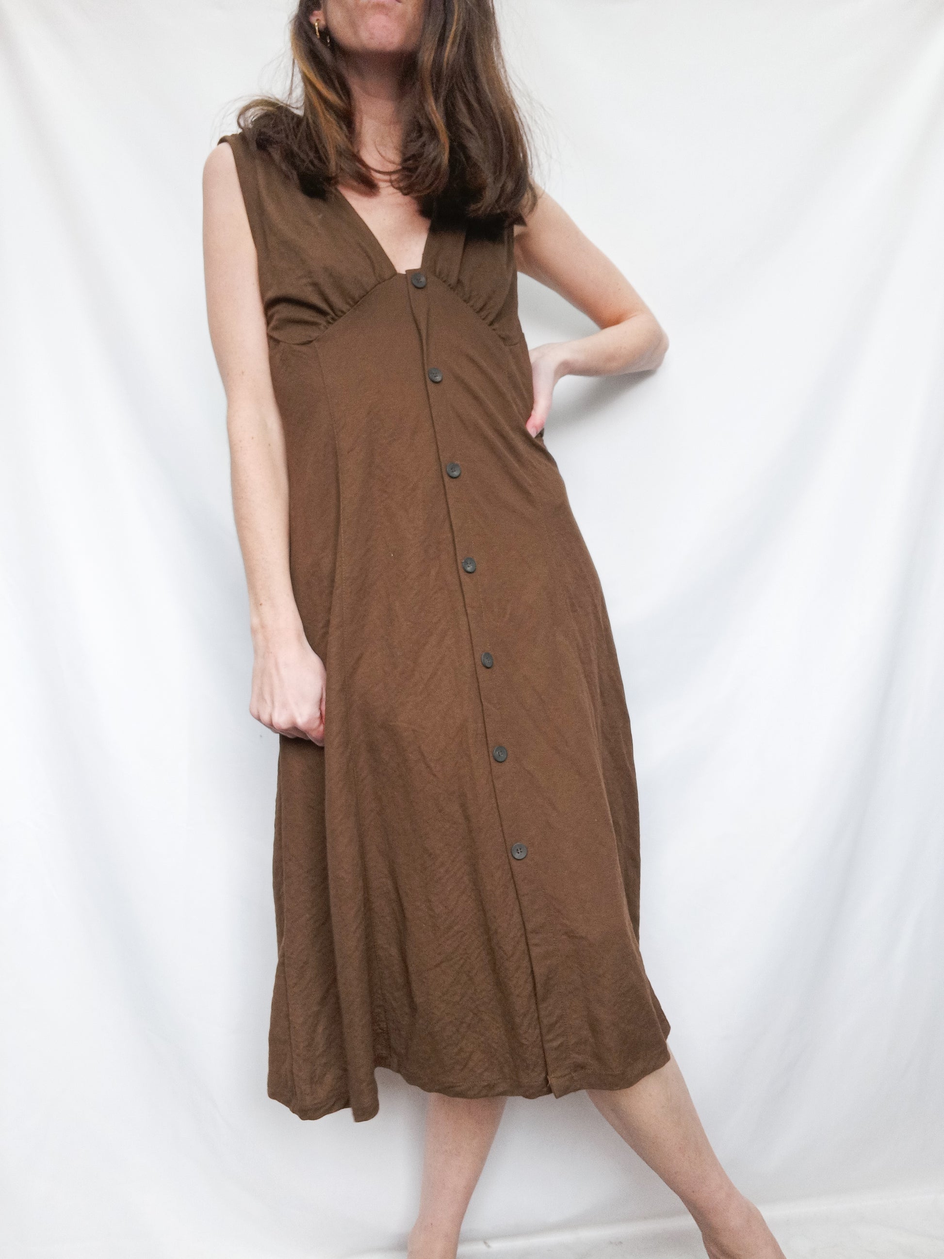 Vestido midi verde abotonado y fluido. Elastico. Largo 104 cm