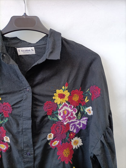 Pull&bear. Blusa negra con flores bordadas. Mangas abullonadas y sueltecita. No elástica. De sisa a sisa 52 cm largo 64 cm