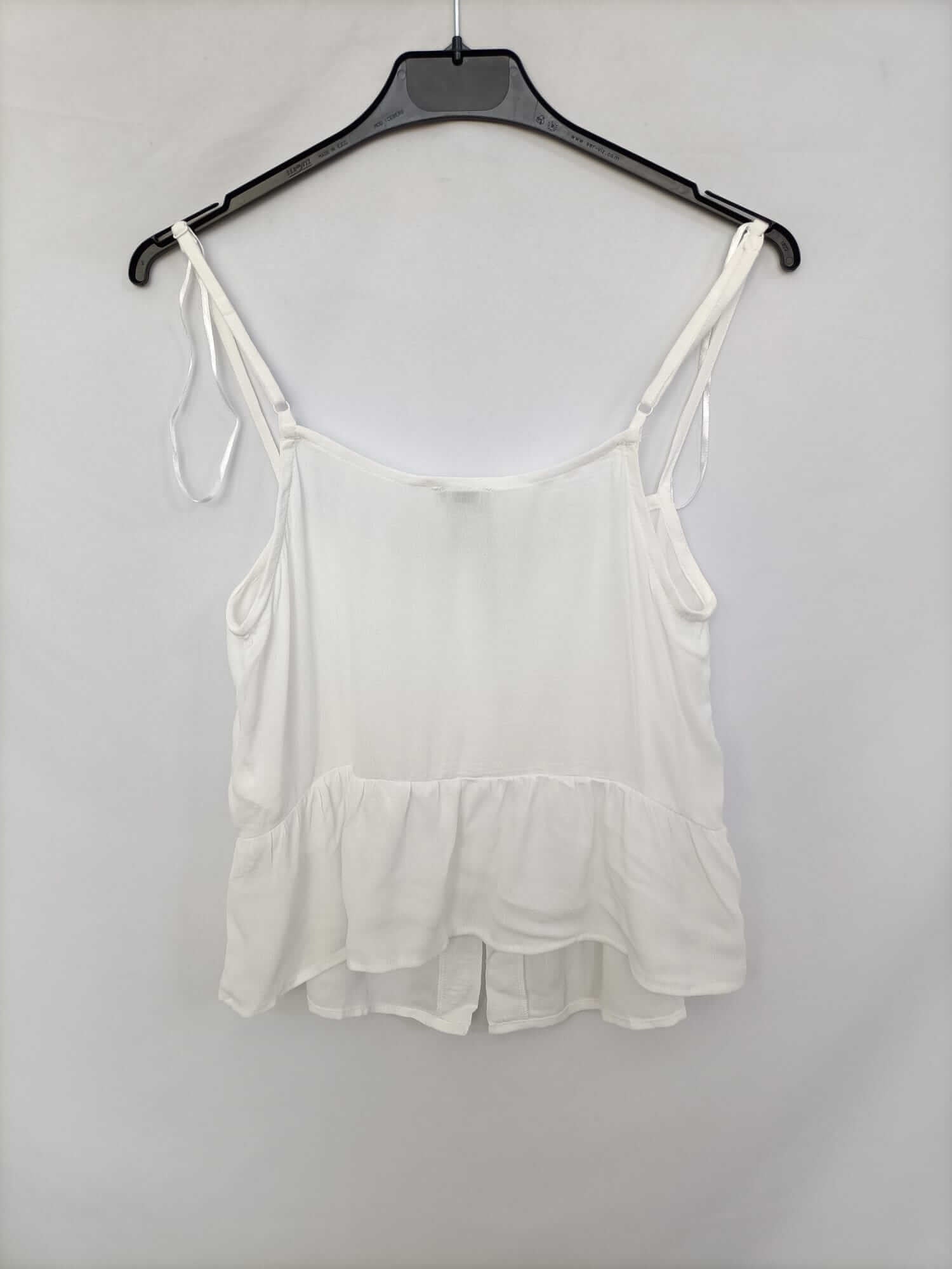 Pull&bear. xs. Top blanco fluida y Abotonado con detalle de encajes. Tirantes ajustables. No elástico. De sisa a sisa 44 cm largo 50 cn
