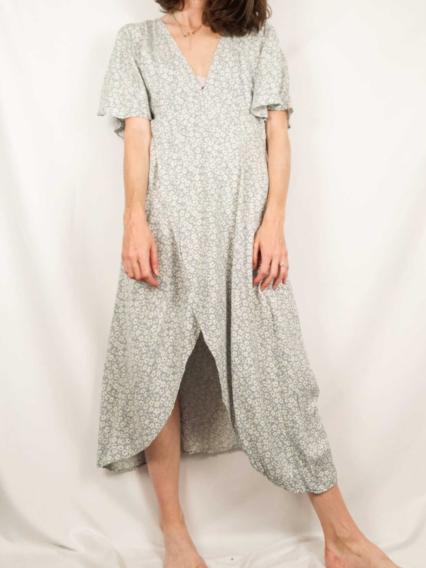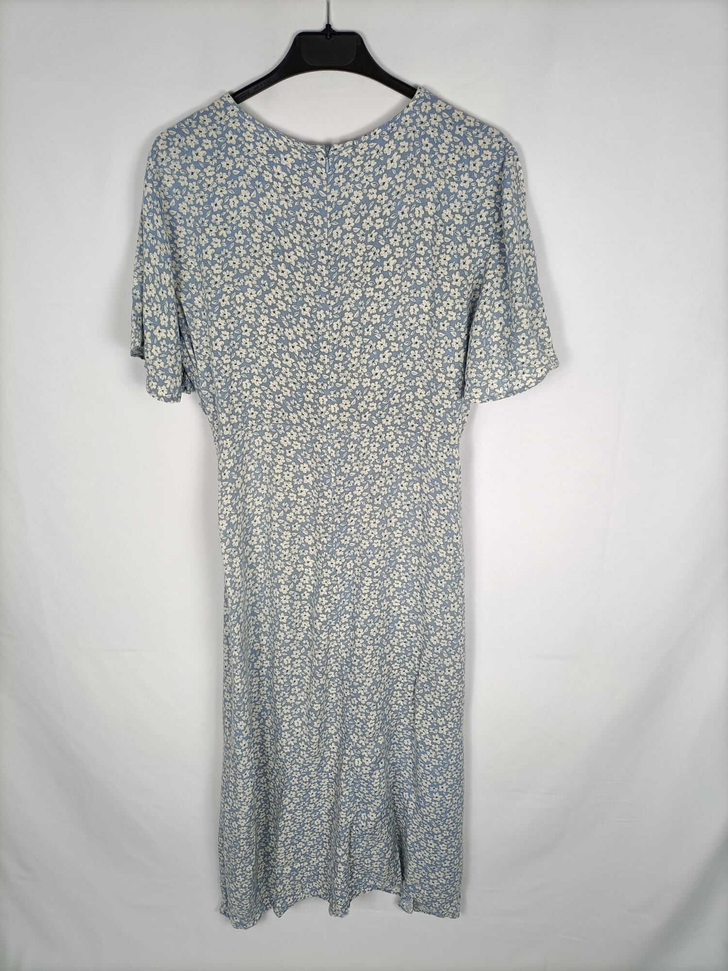Pull&bear. Vestido midi celeste con margaritas. Mangas fluida y falda cruzada. No elástico. De sisa a sisa 50 cm largo 123 cm