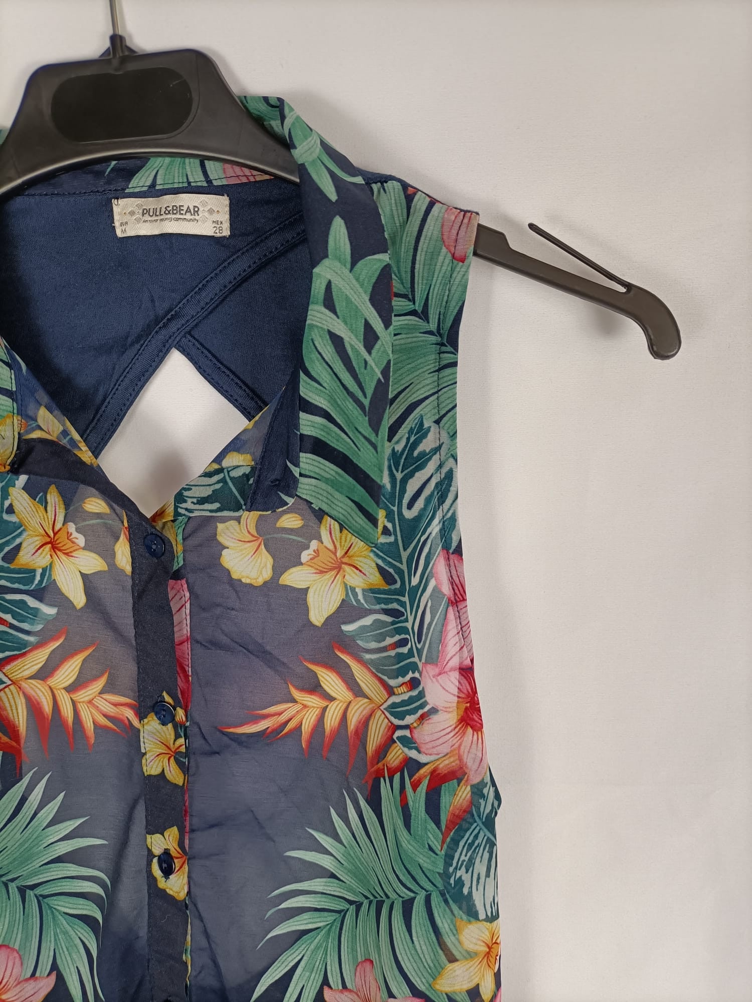 Pull&bear. M. Blusa azul con flores hawaianas. Doble textura y espalda al aire. Largo 79 cm