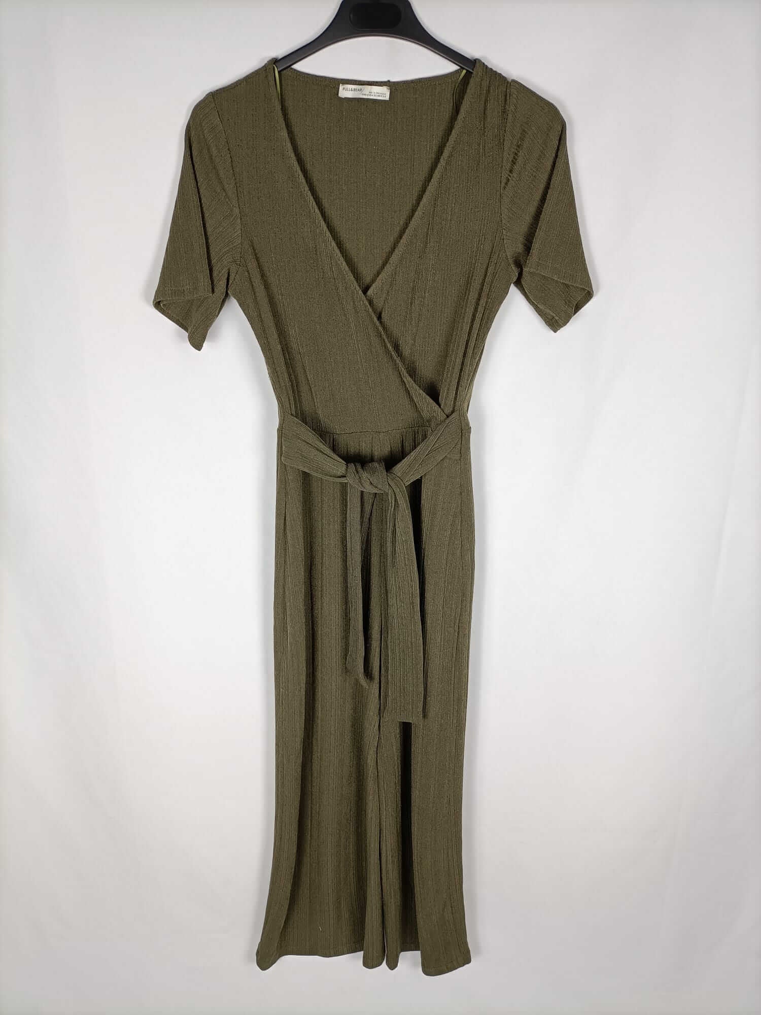 Zara. Xs. Mono verde caqui de punto de canalé fluido y elastico. Detalle de lazada. Largo 123 cm