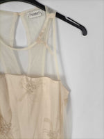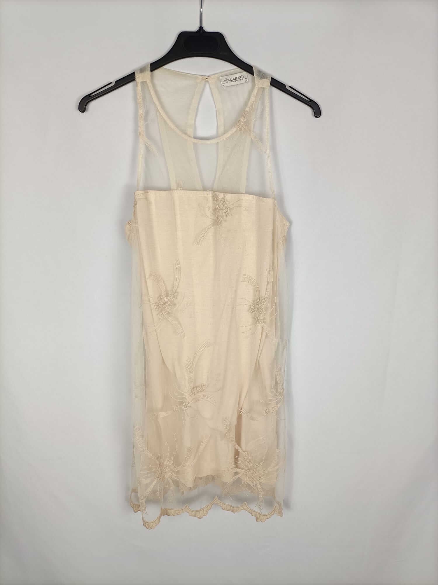 Pull&bear. M. Vestido beige de rejilla bordado con el escote halter semitransparente. Elástico. Largo 83 cm