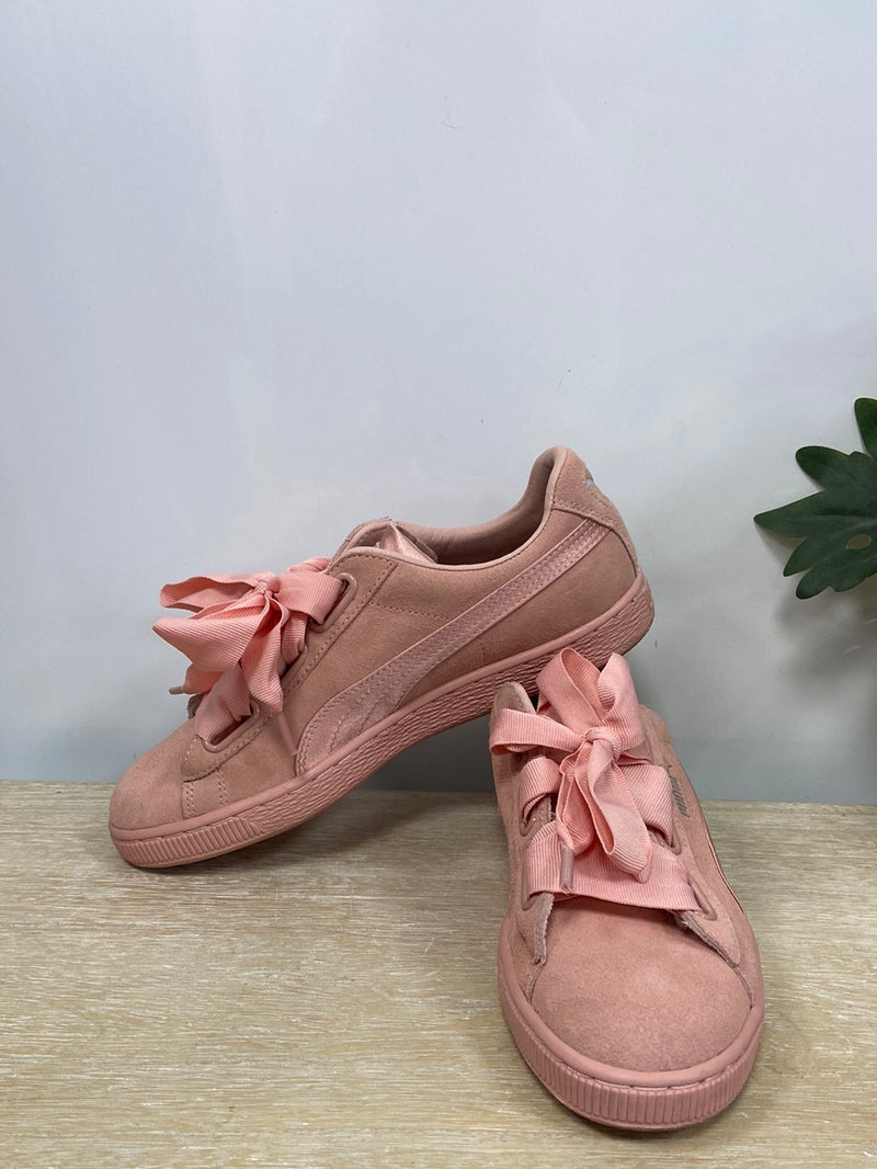 zapatillas rosas con cordones lazada. En el exterior, tipo antelina. Tiene alguna marca de uso .