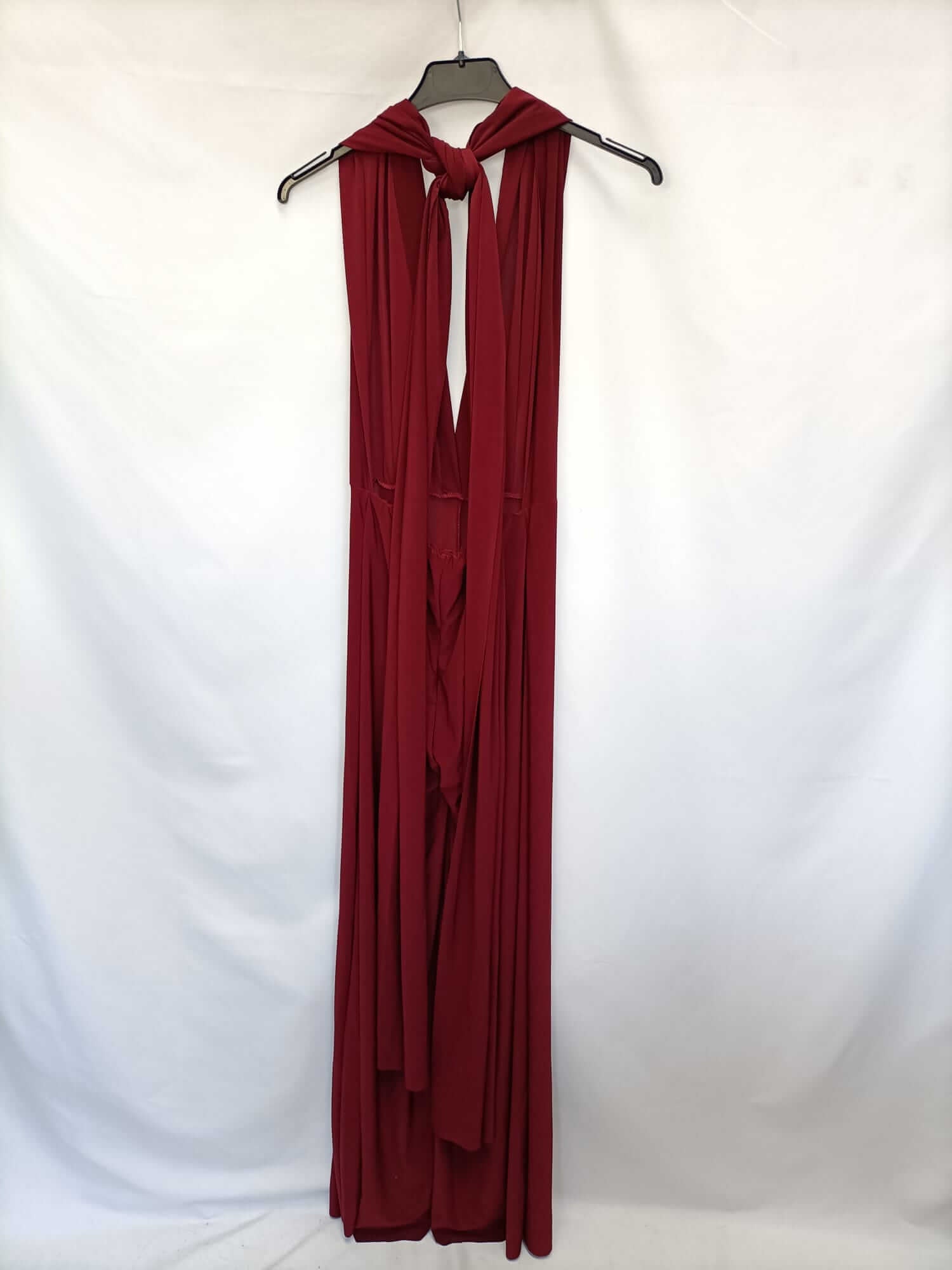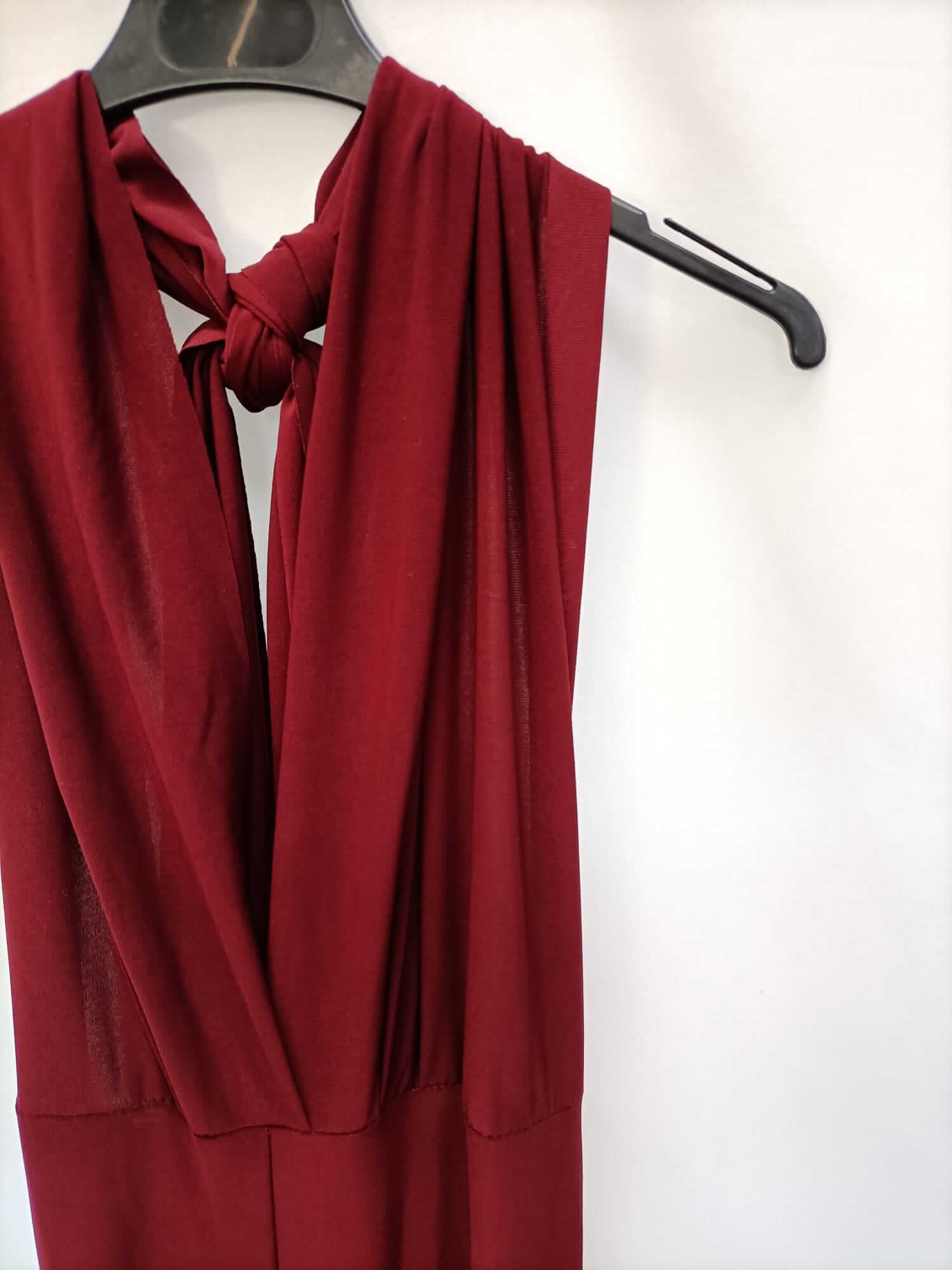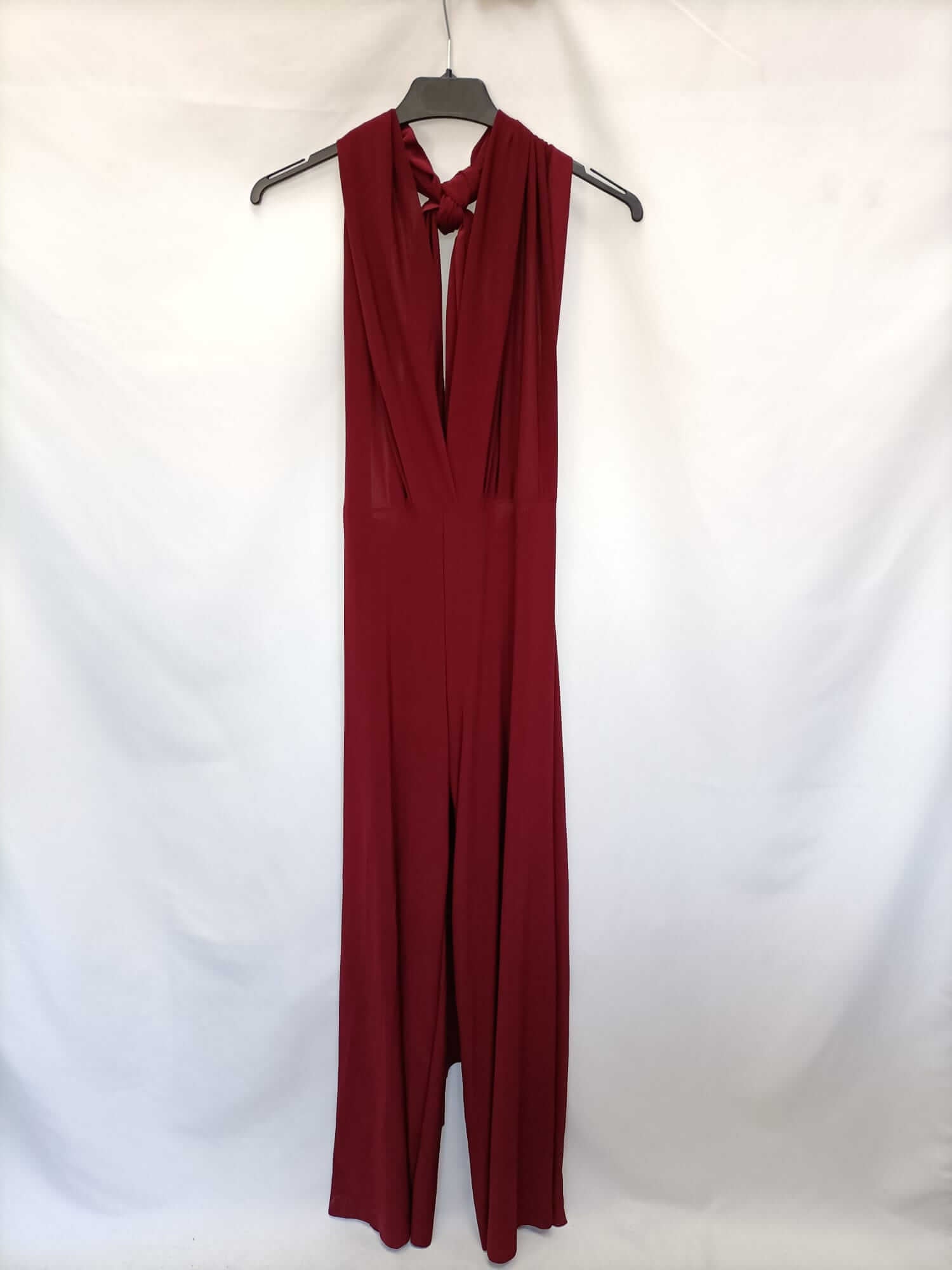 Pura vida. M. NUEVO CON ETIQUETA. Mono burdeos largo de tejido tipo licra elástica. Escote pronunciado ajustable. Largo 160 cm
