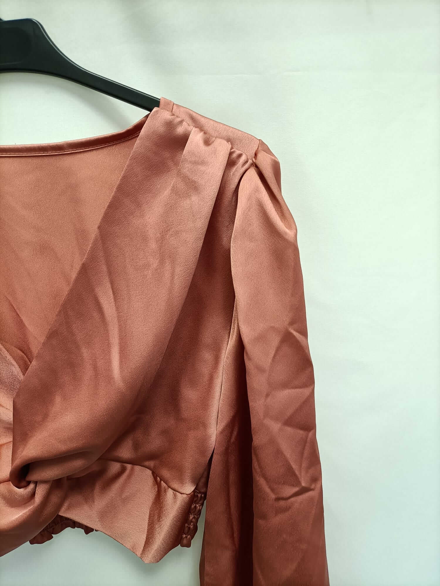 Pura vida. Tu (s/m). NUEVO CON ETIQUETA. Top rosa oscuro satinado con nudo delantero. Elastico en la cintura y mangas Abullonadas. No elástico. De sisa a sisa 44 cm largo 35 cm