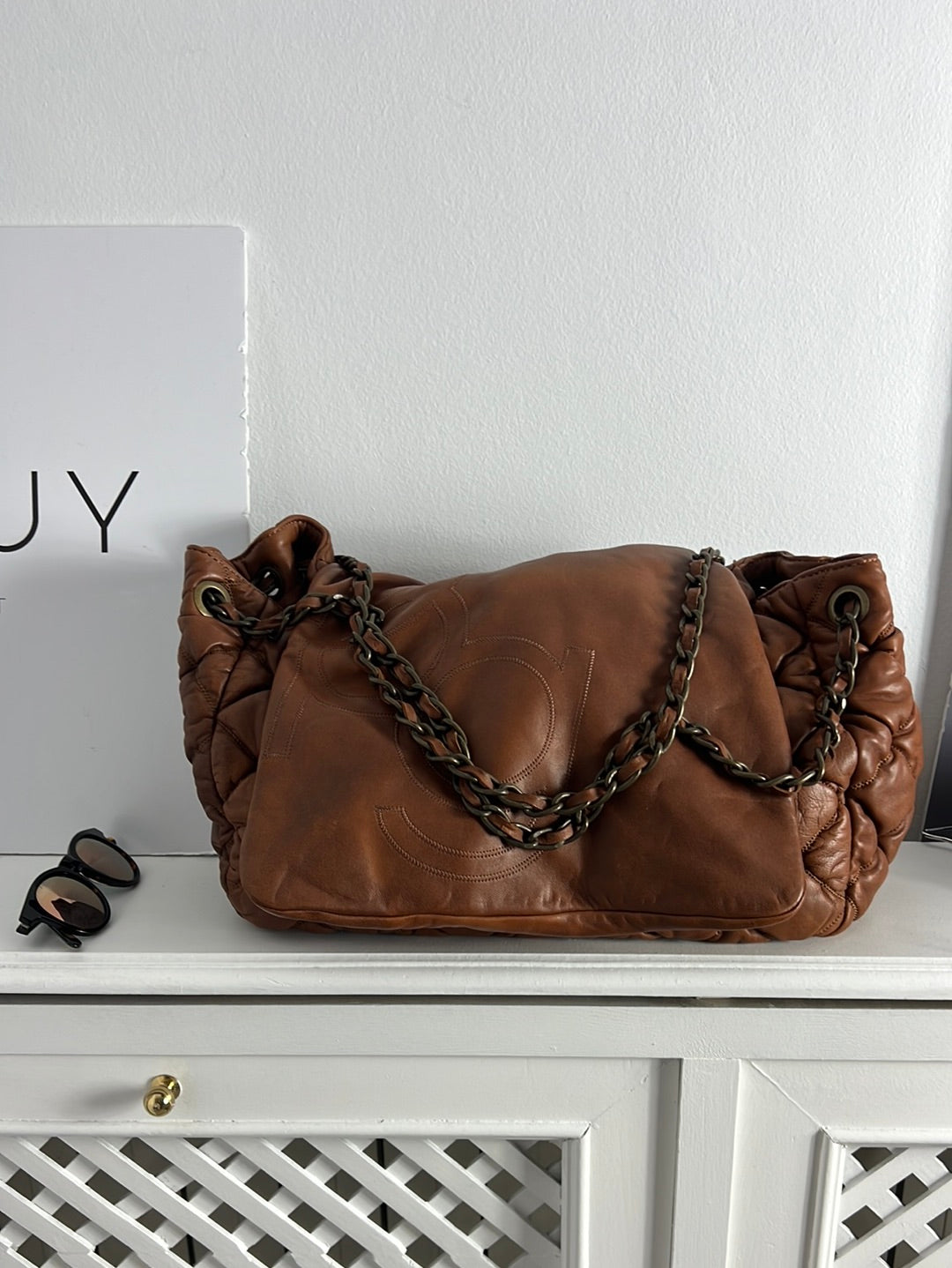 Bolso shopper marrón de tejido guateado. es piel pero sin etiqueta acreditativa