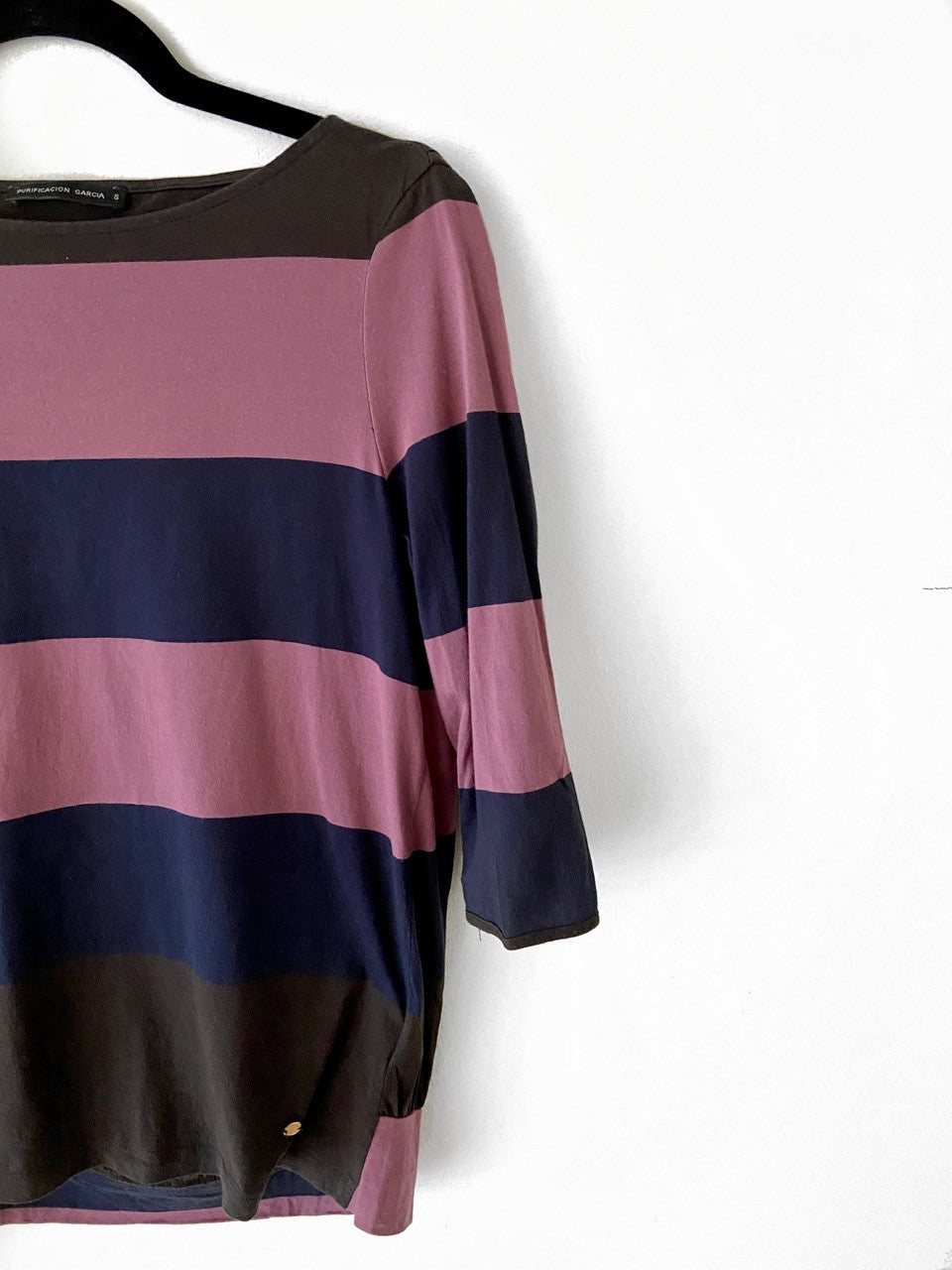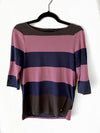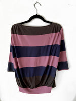 Camiseta de rayas azules, rosas y marrones con el cuello barco y manga 3/4