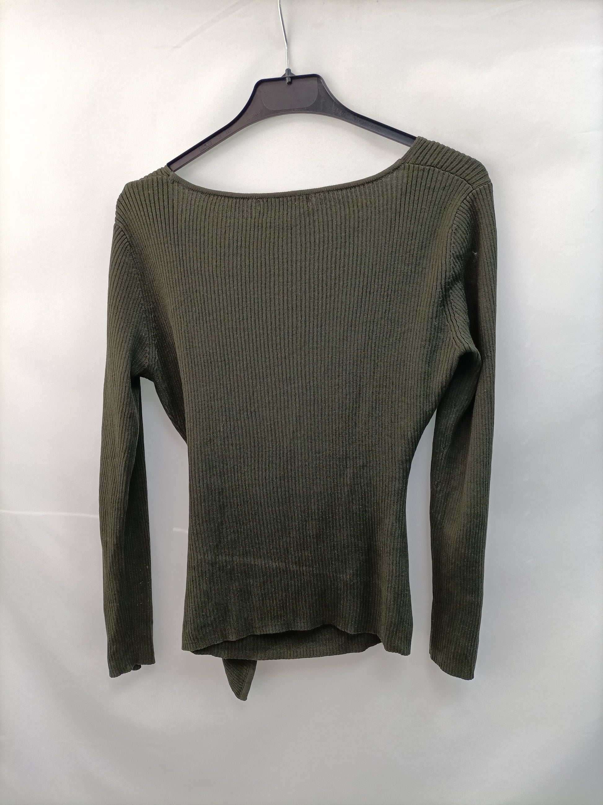Jersey verde caza de tela punto canalé, ajustadito, con hebilla plateada en el lateral que hace que sea cruzado.