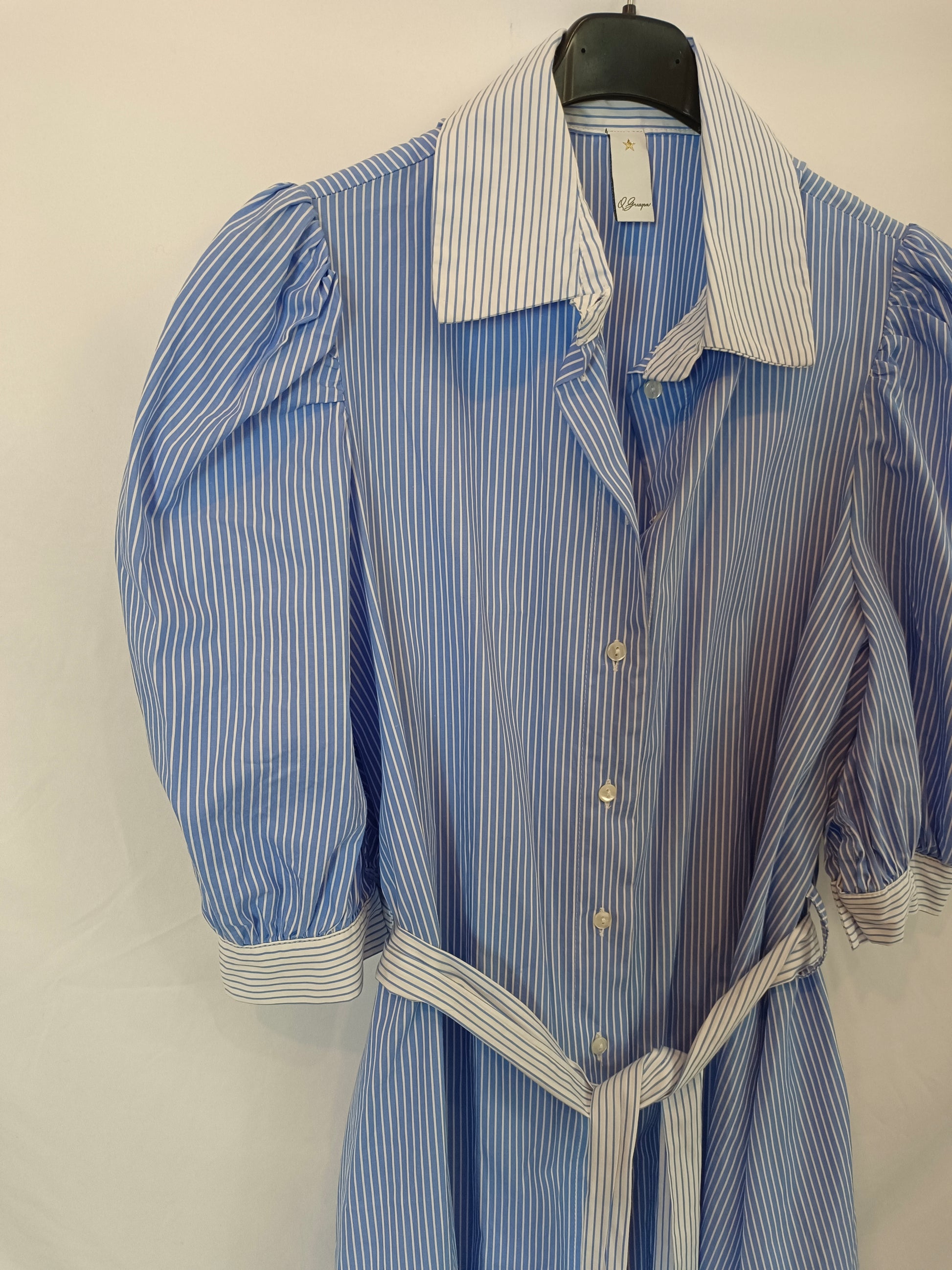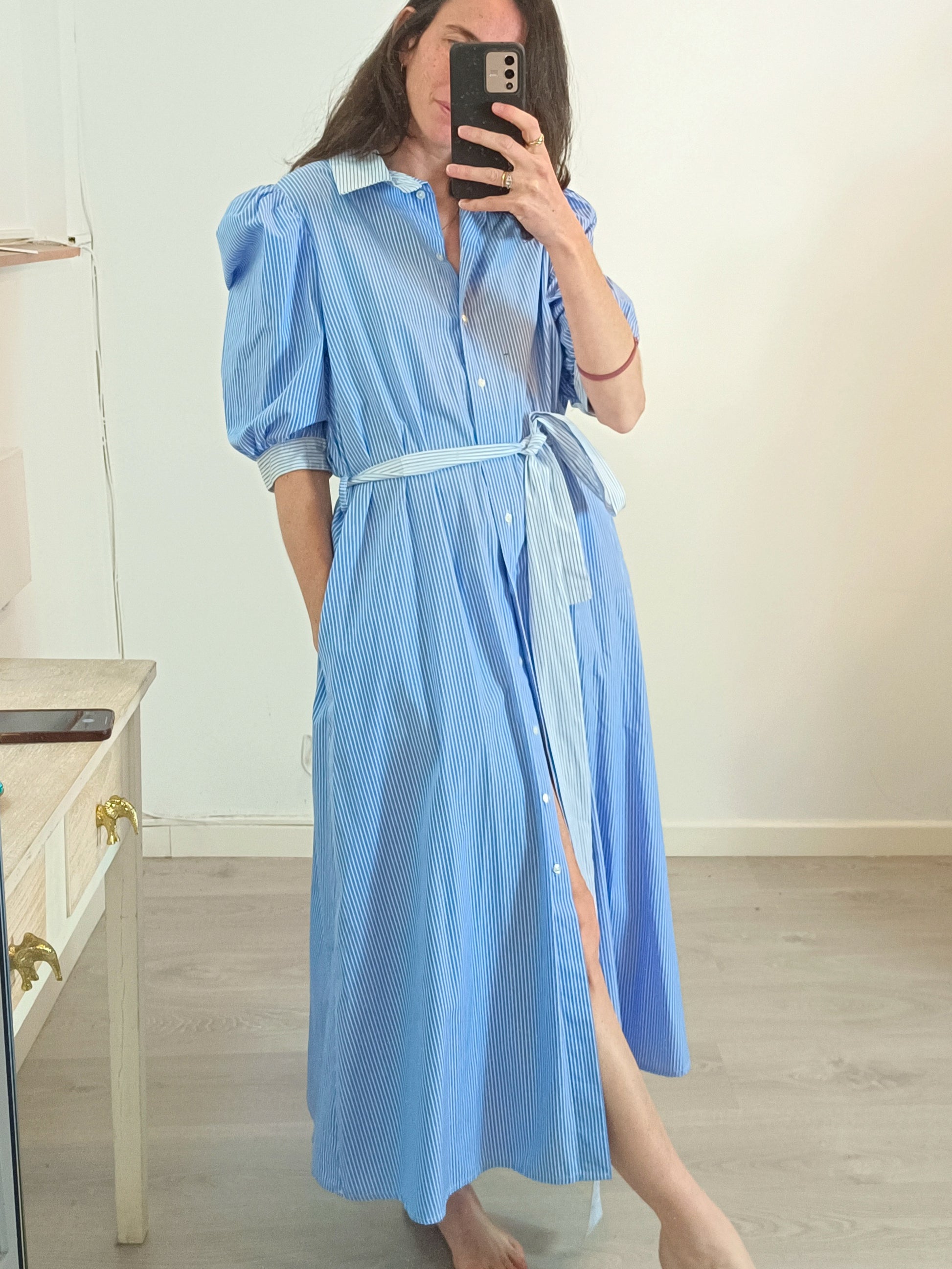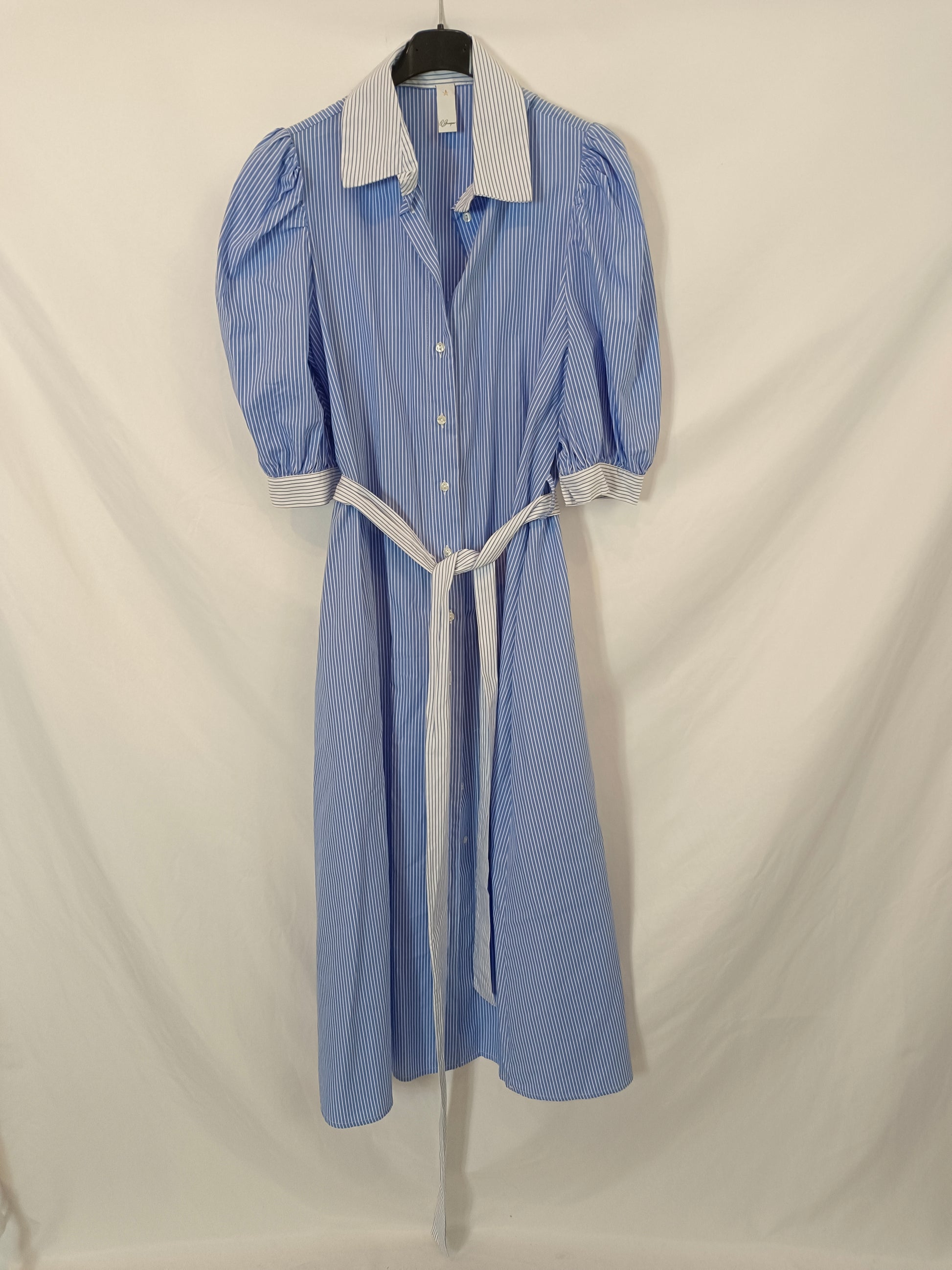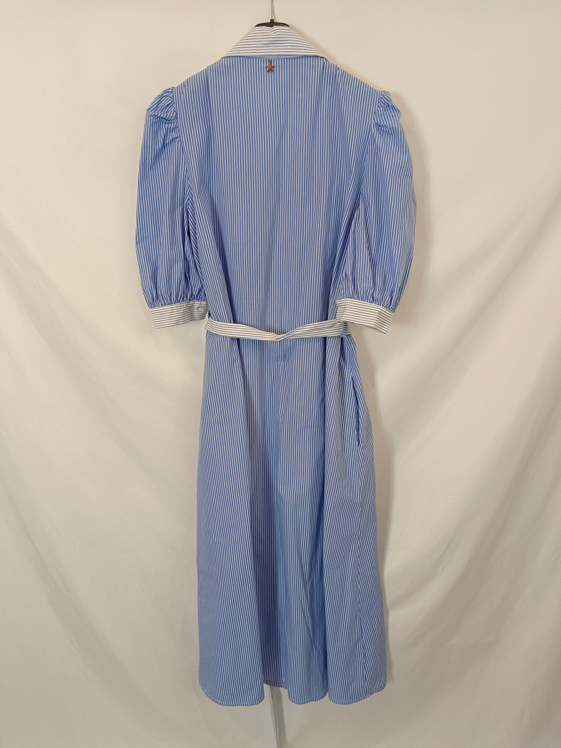 vestido midi camisero de rayas blanco y azul con las mangas abullonadas. Espalda 36 cm largo 121 cm