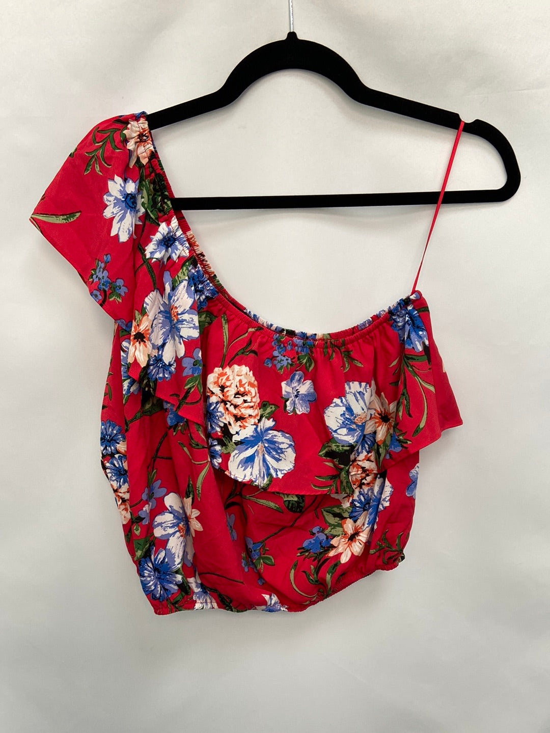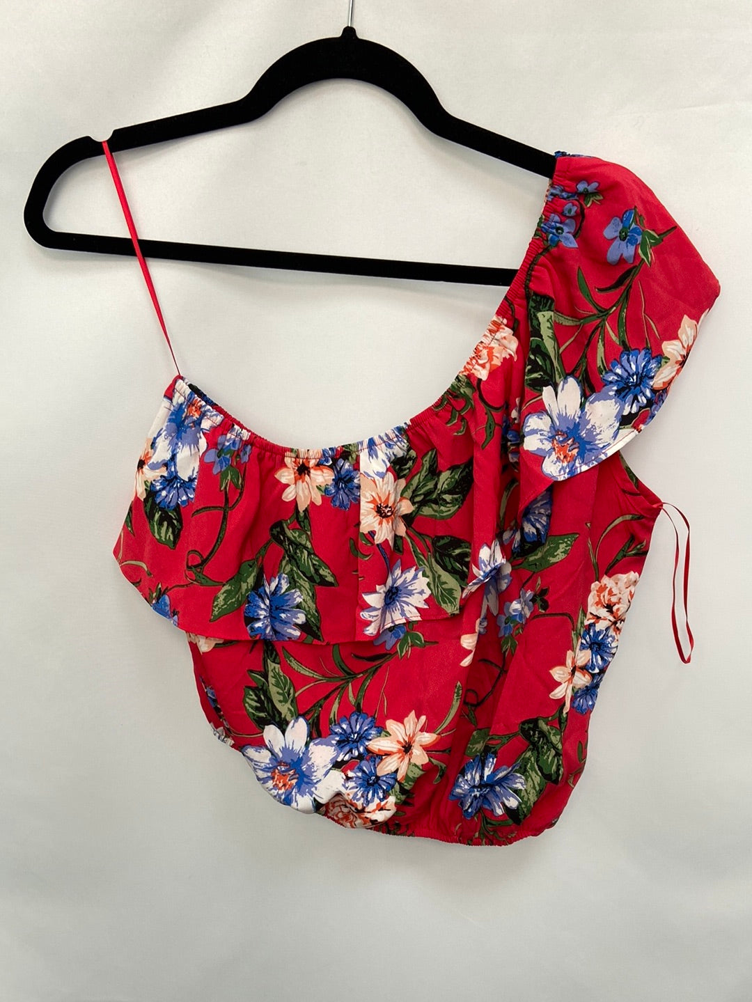 Top rosa fucsia de flores asimétrico con goma en el escote y en la cintura