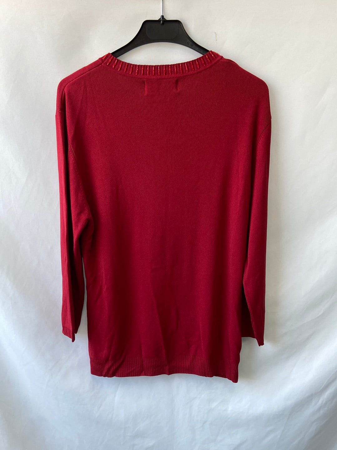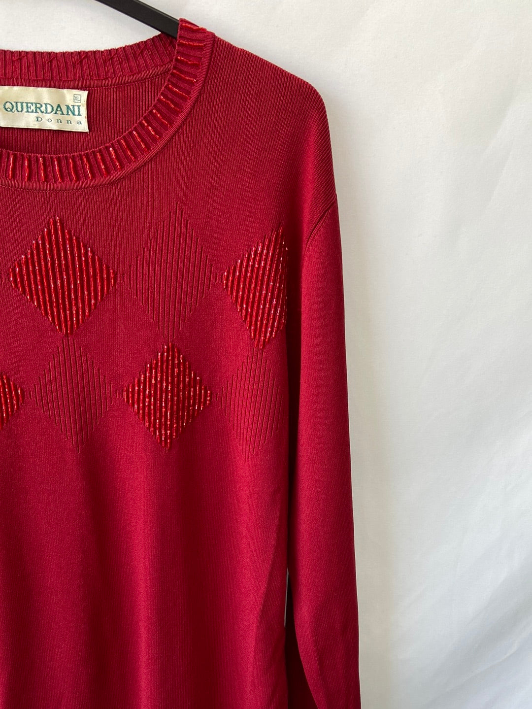 Jersey rojo con detalles de pedrería en forma de rombos en el pecho. Elástico. Largo 64 cm