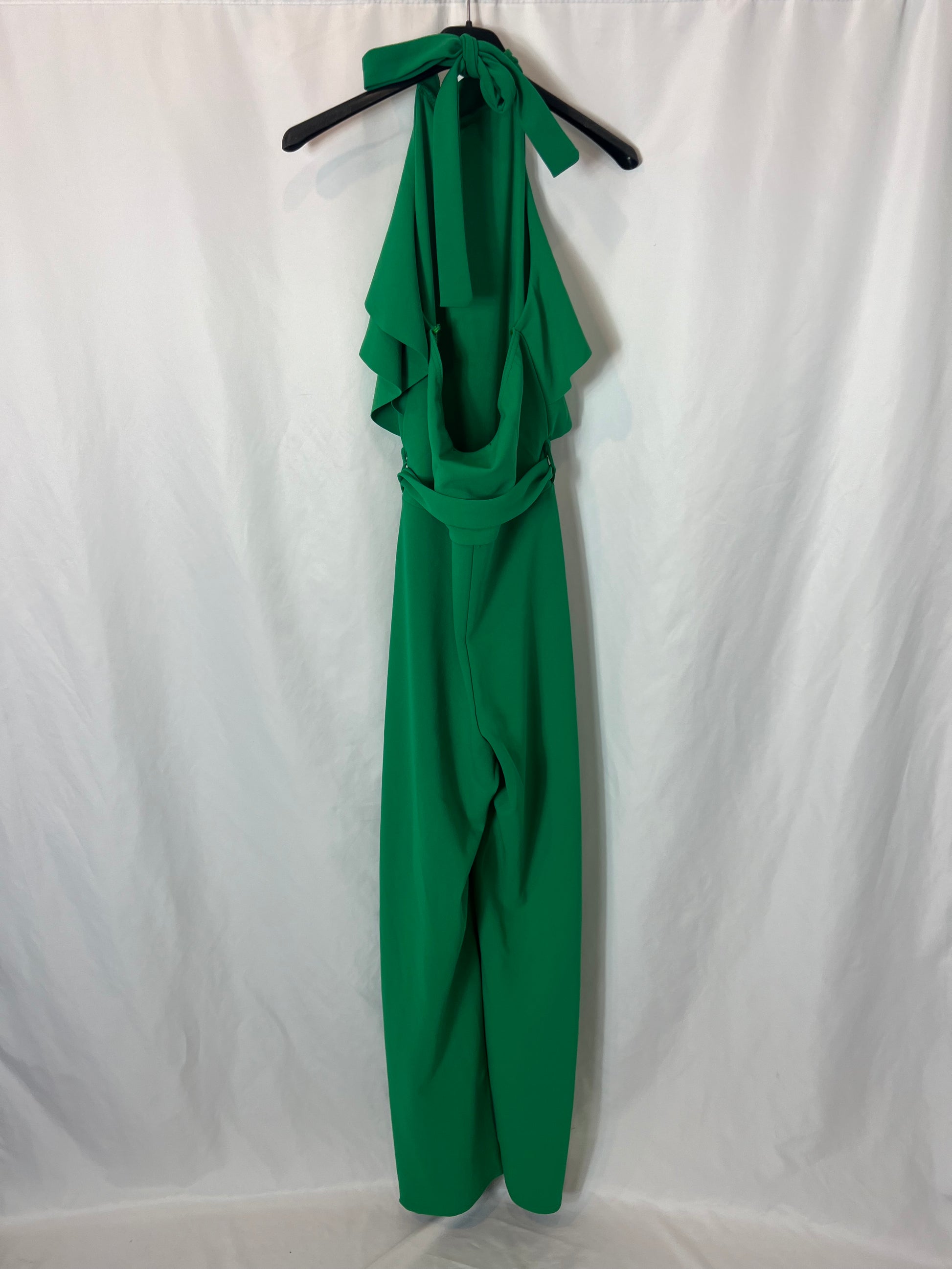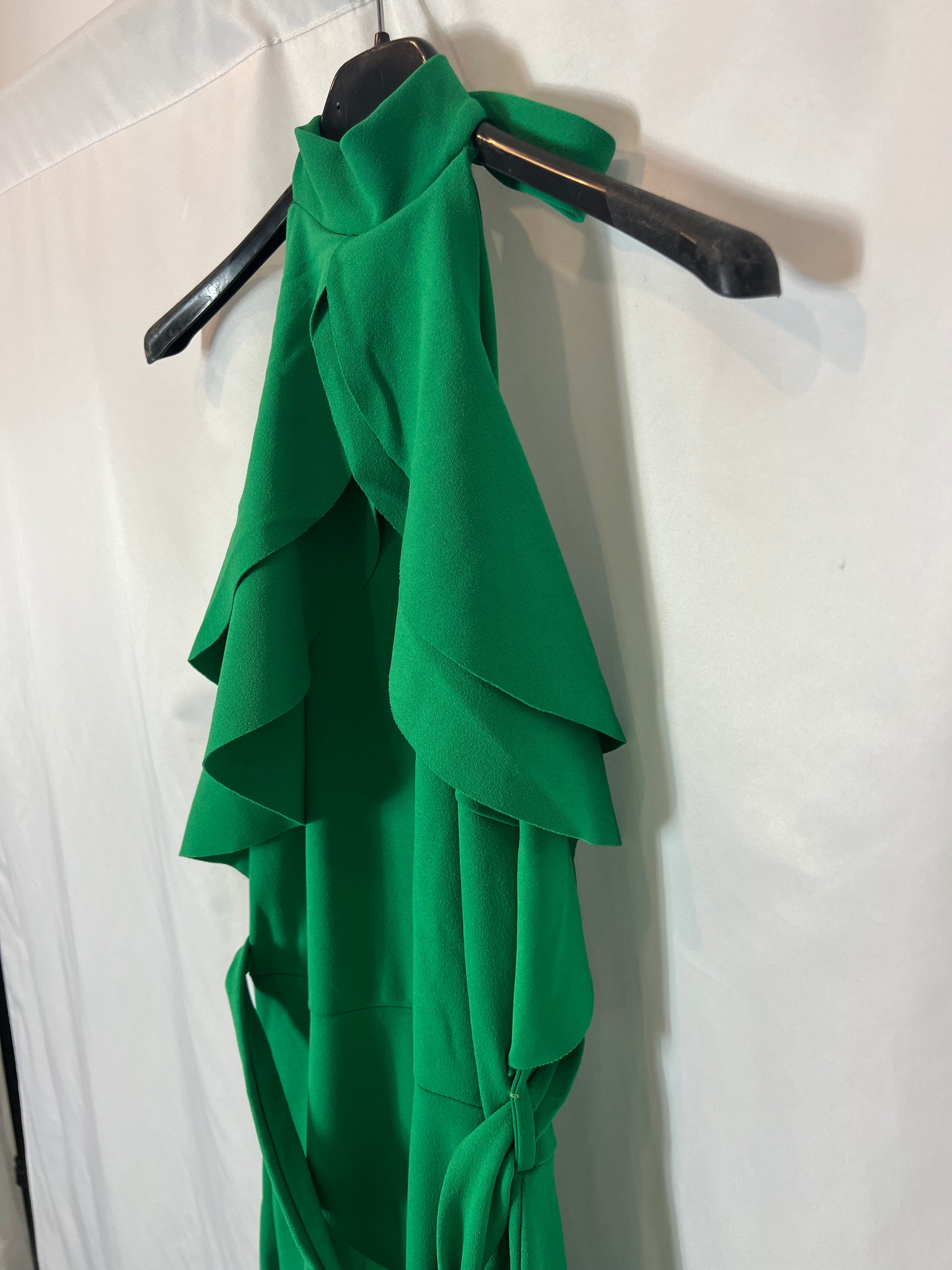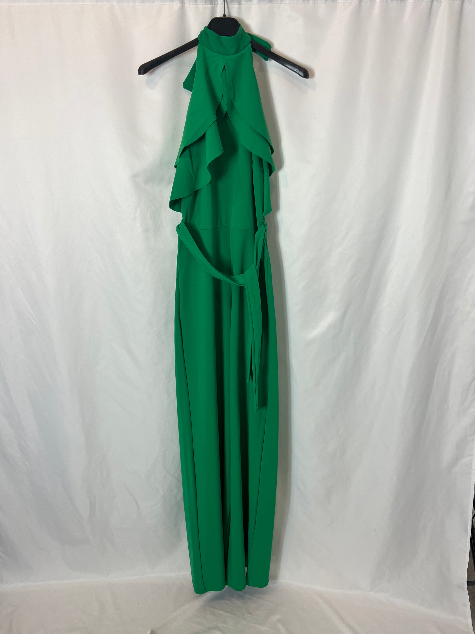 Mono largo verde escote halter atado al cuello con volantes. Espalda al aire. Tejido elástico.