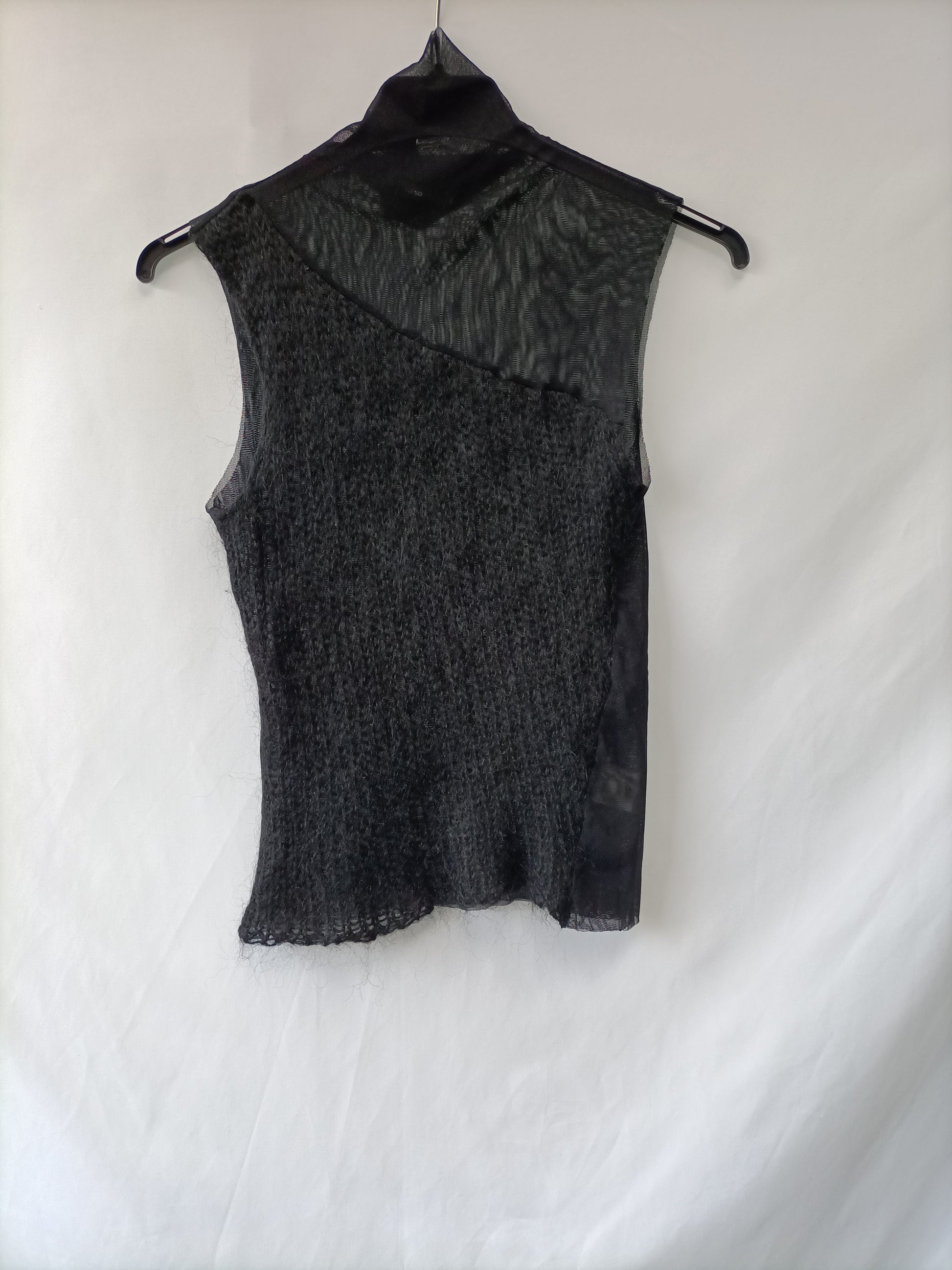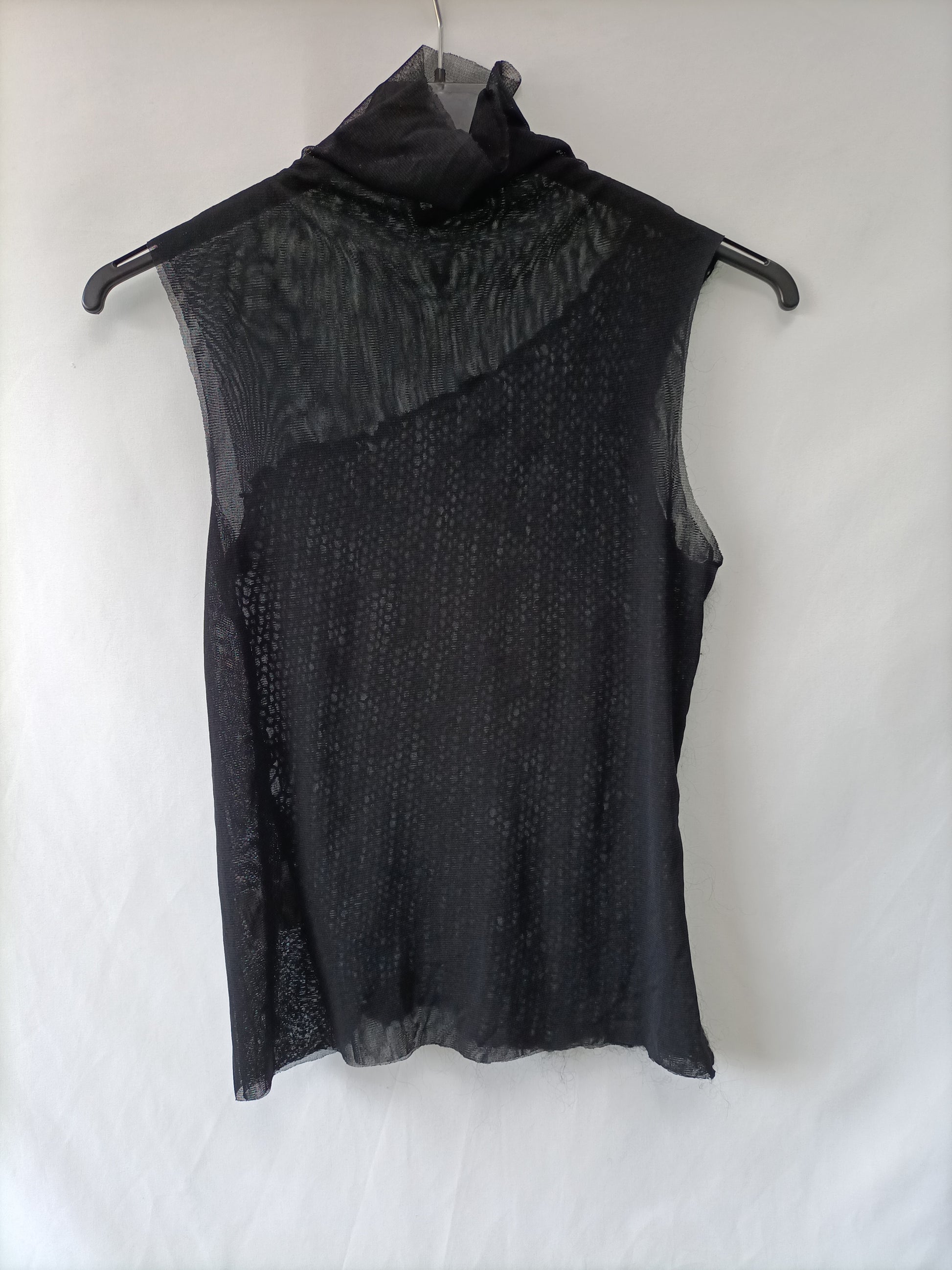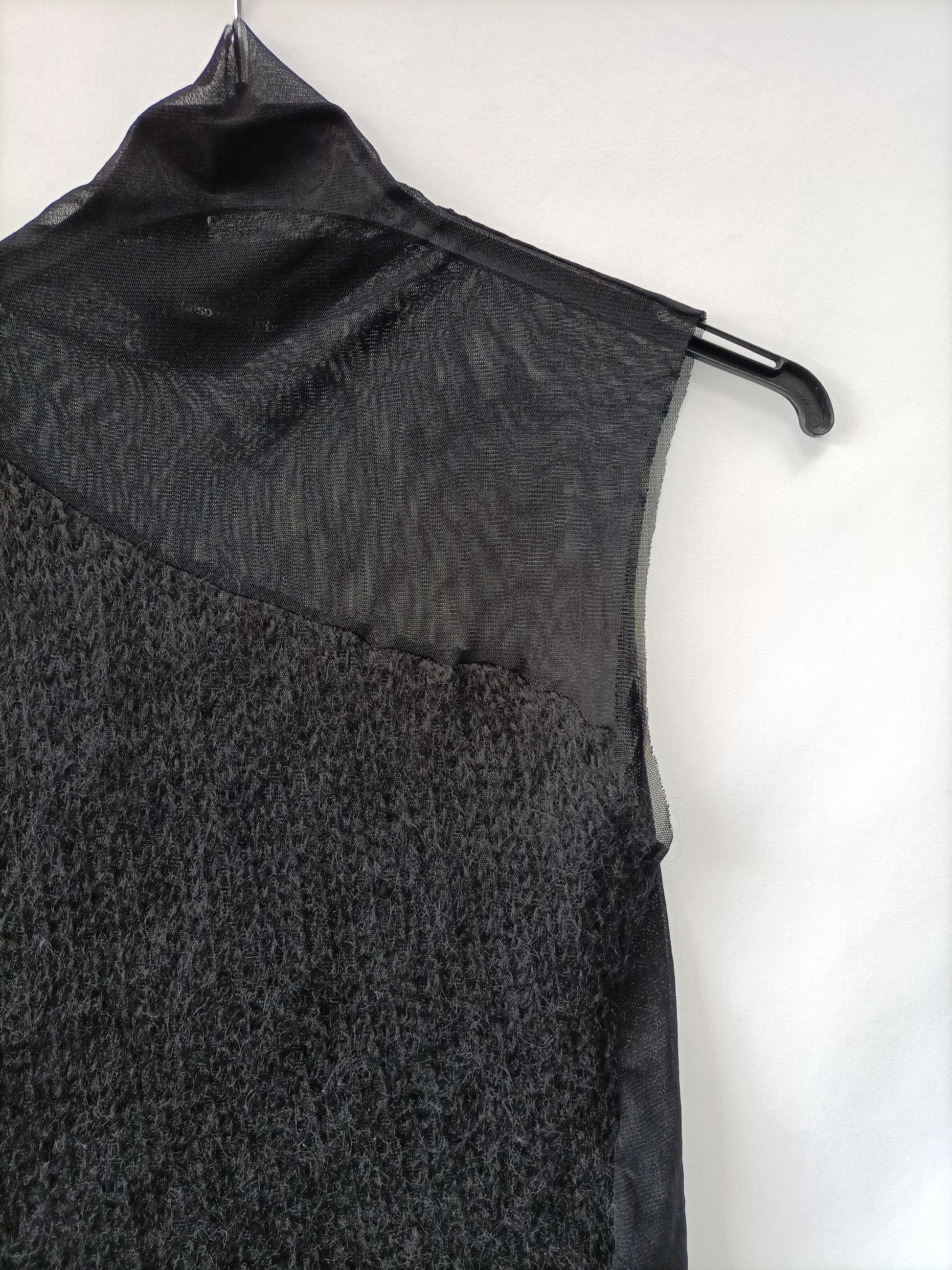 Top negro de punto doble textura tull y punto. Elástico y ajustado. Largo 54 cm