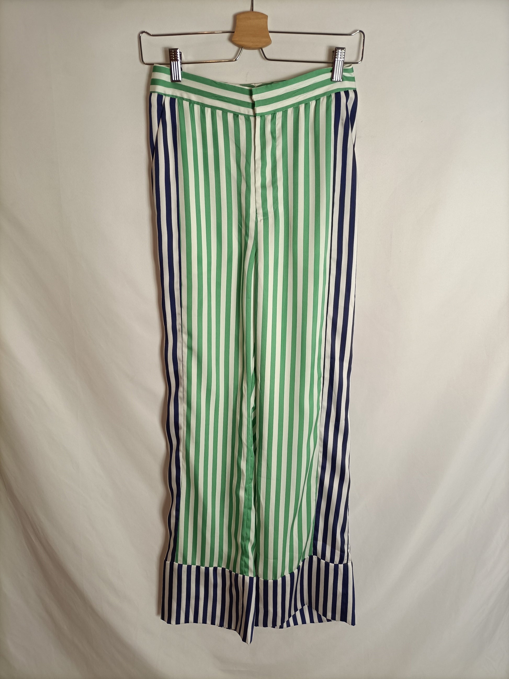 Pantalón palazzo de rayas verdes, azules y blancas. Fluida y fino. no elástico. cintura 33 cm