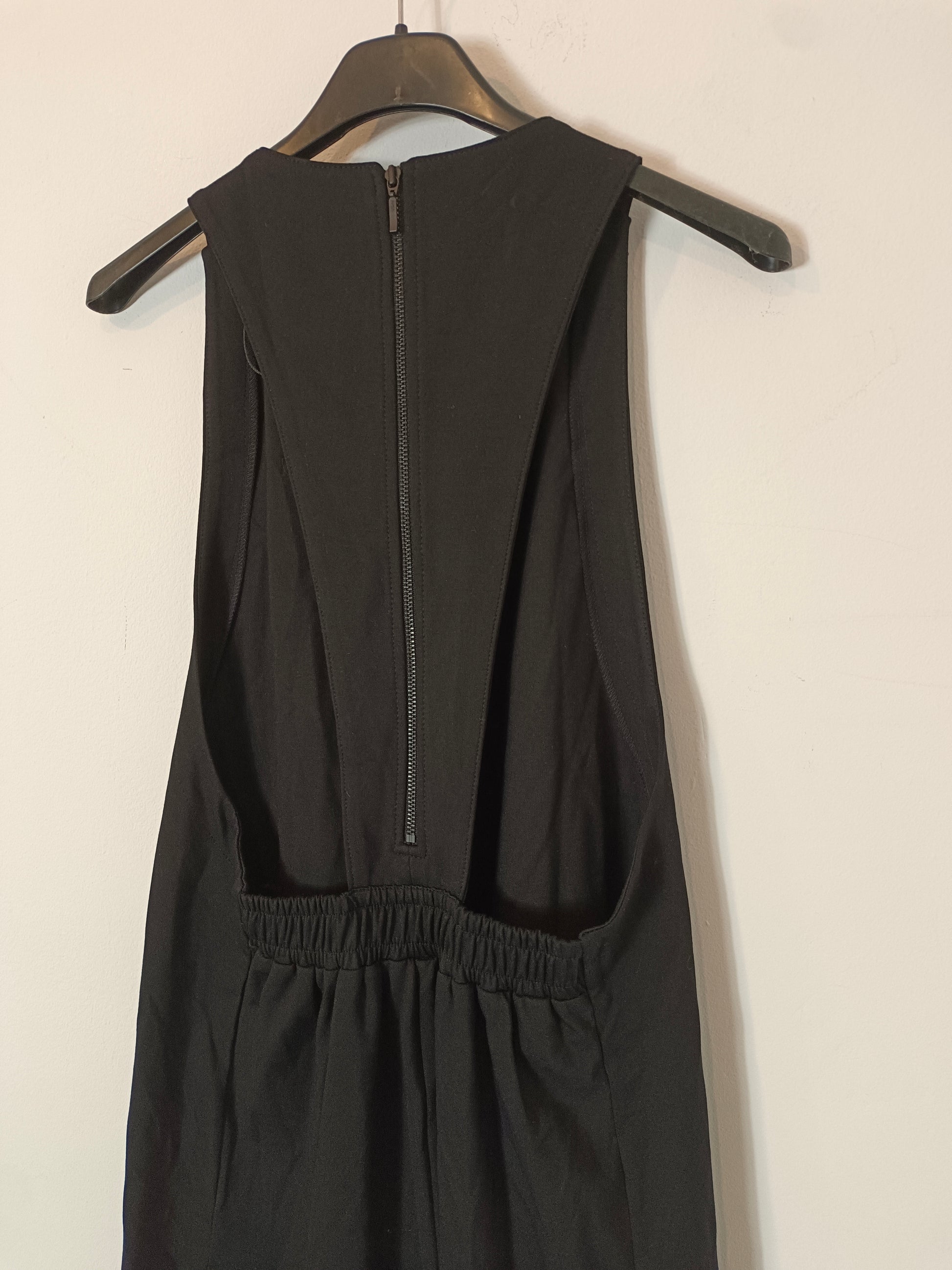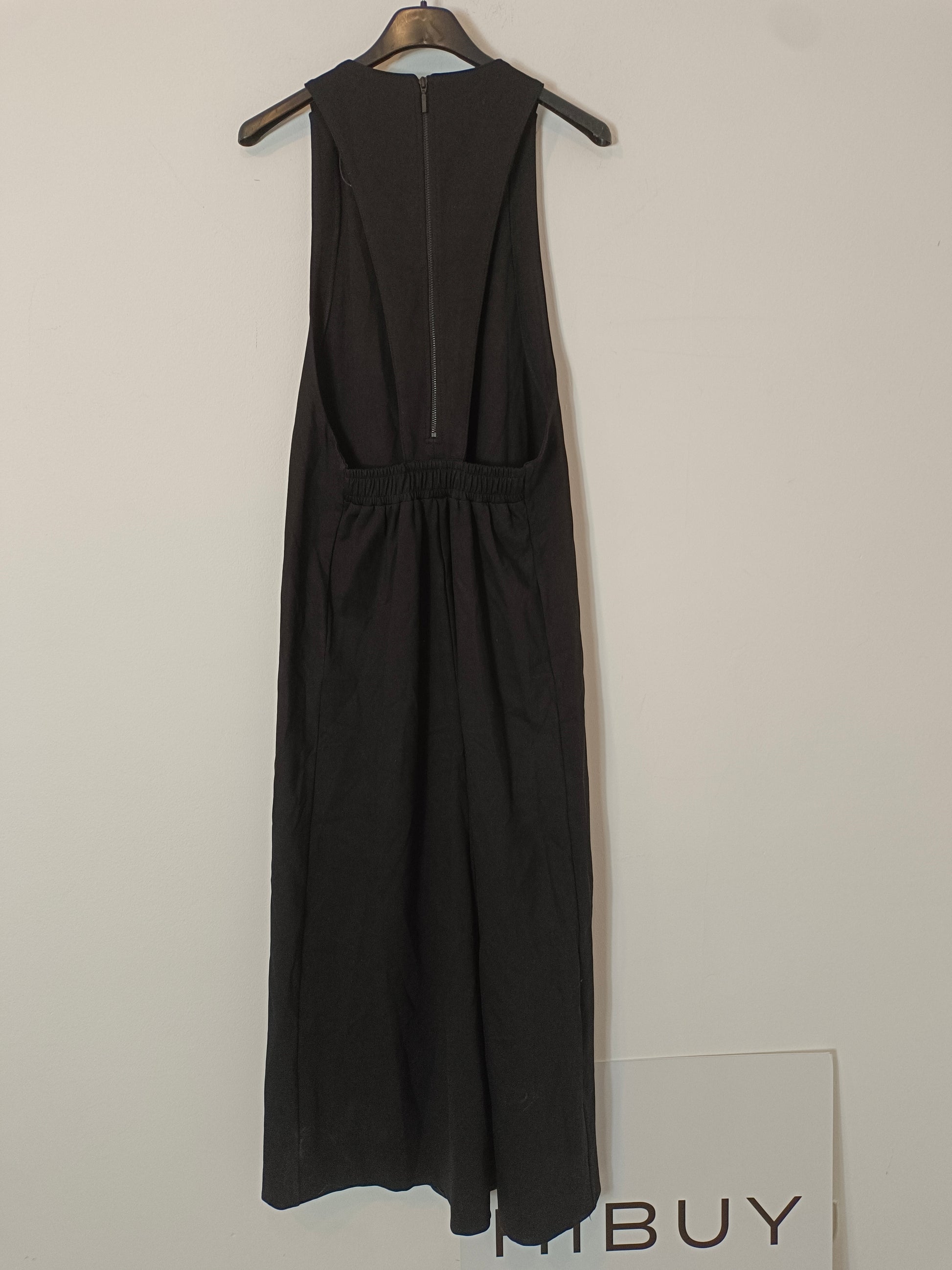 Vestido negro largo/midi con la espalda baja con cremallera. Tejido elástico.