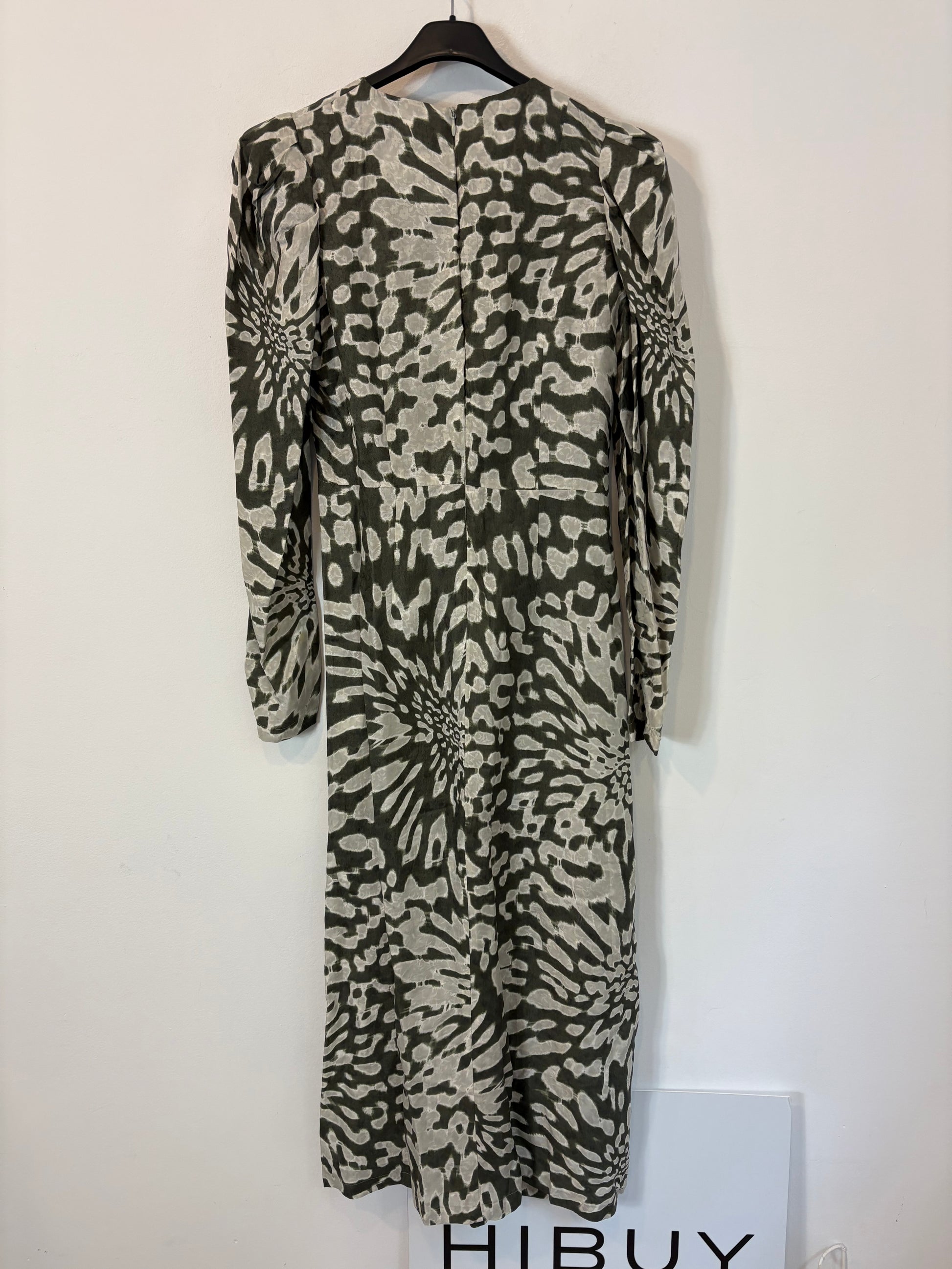 Vestido largo verde y blanco efecto print con detalle en la cintura y hombreras. Espalda 47cm, largo 131cm
