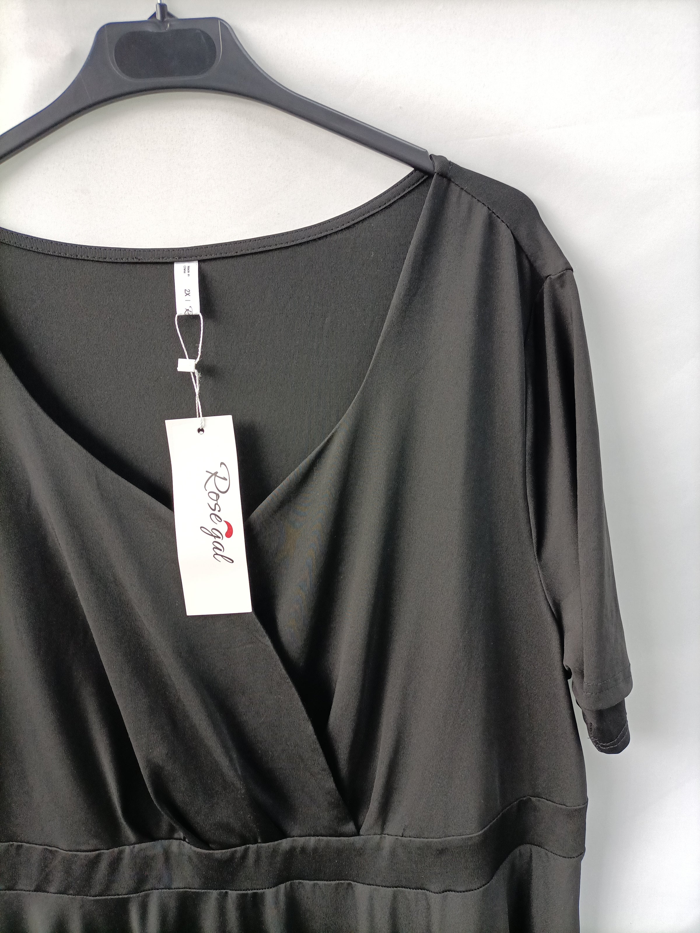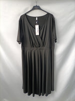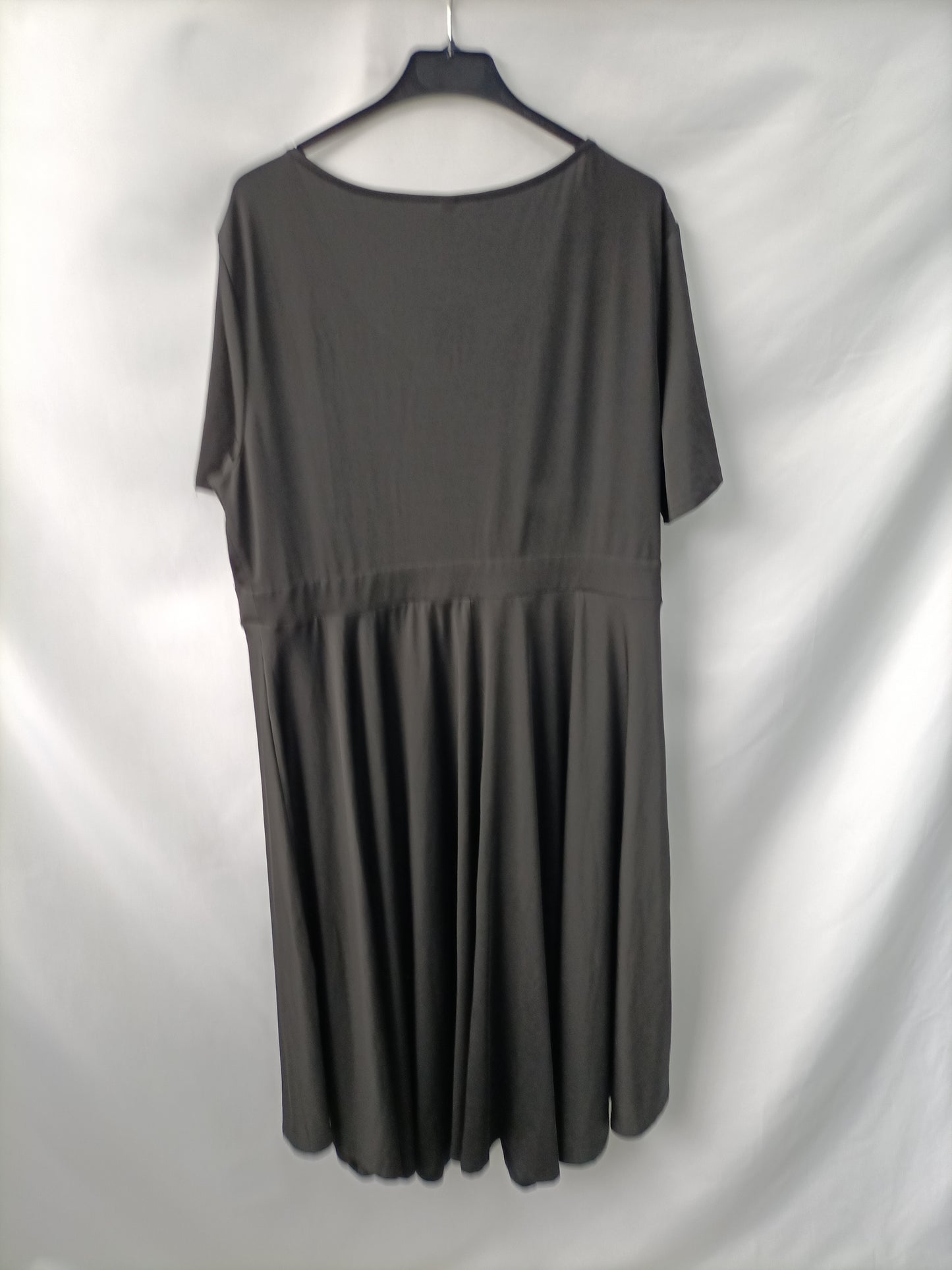 NUEVO CON ETIQUETA. Vestido negro midi con escote cruzado y corte debajo del pecho. Es fluido y elástico. De sisa a sisa 54 cm largo 117 cm