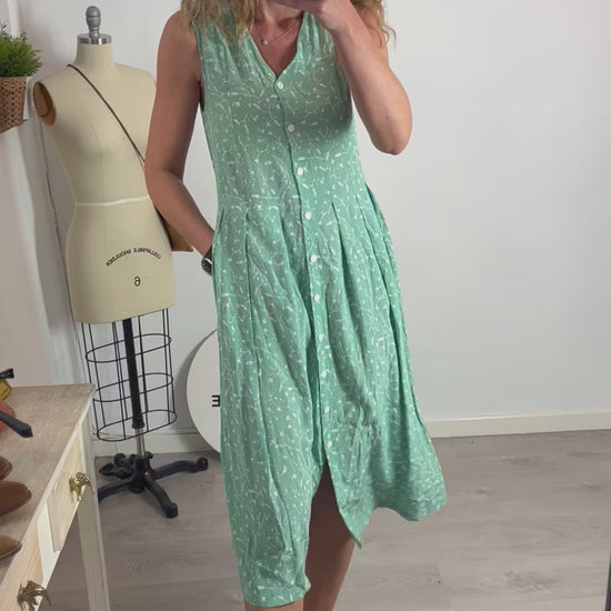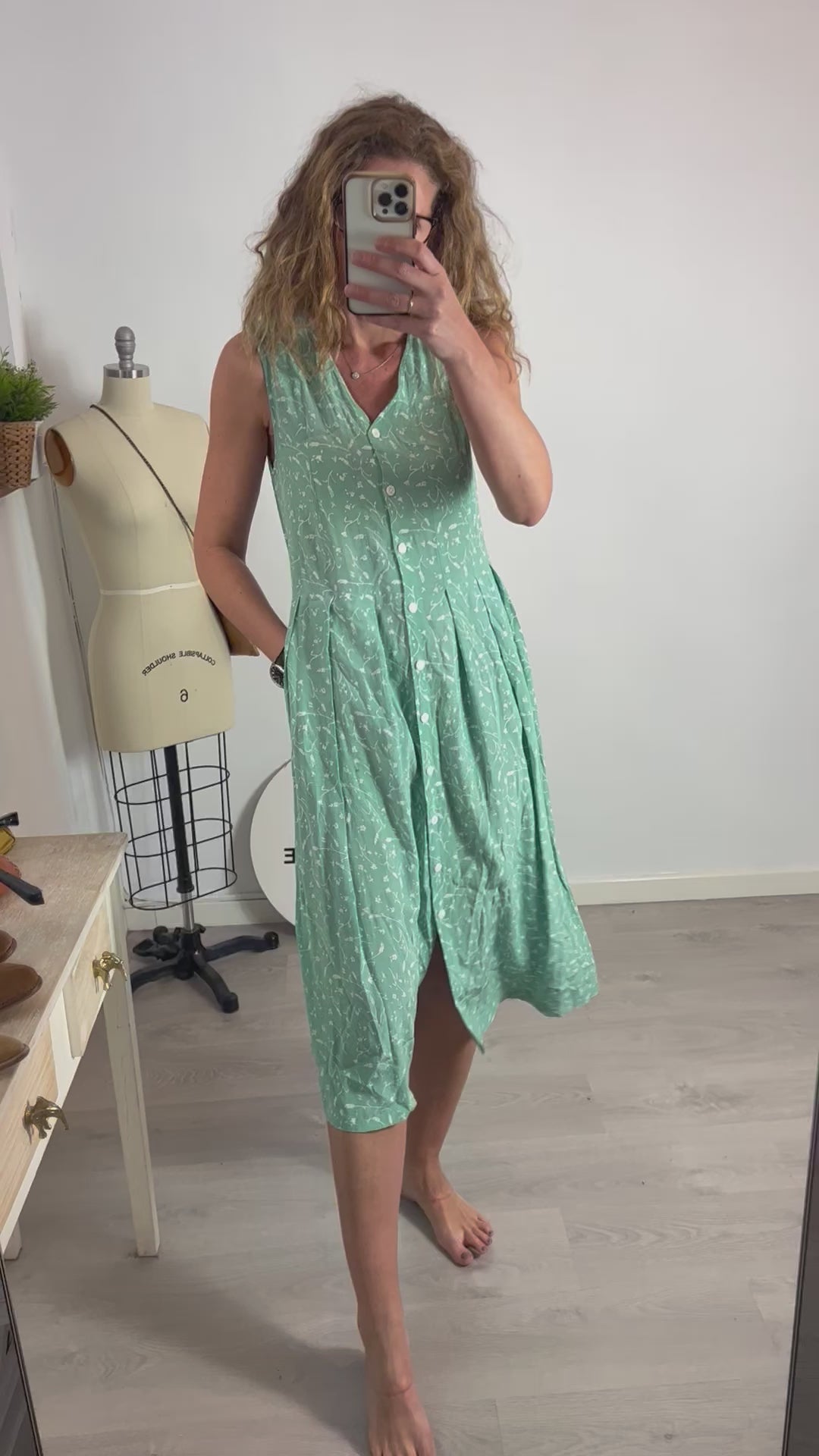 vestido midi fluido abotonado verde con flores. De sisa a sisa 48cm, largo 126cm