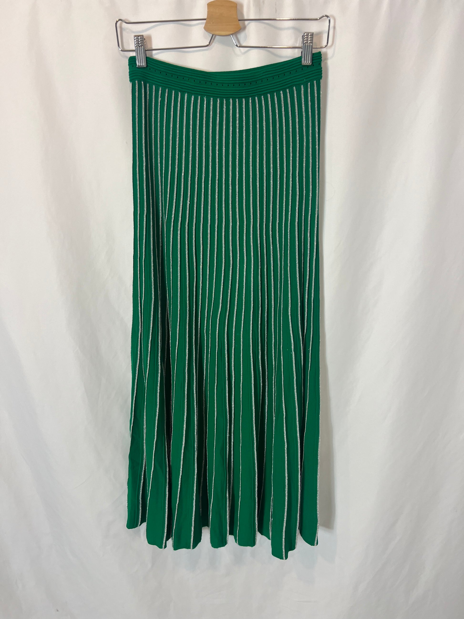 falda verde de punto con detalle de rayas plateadas.