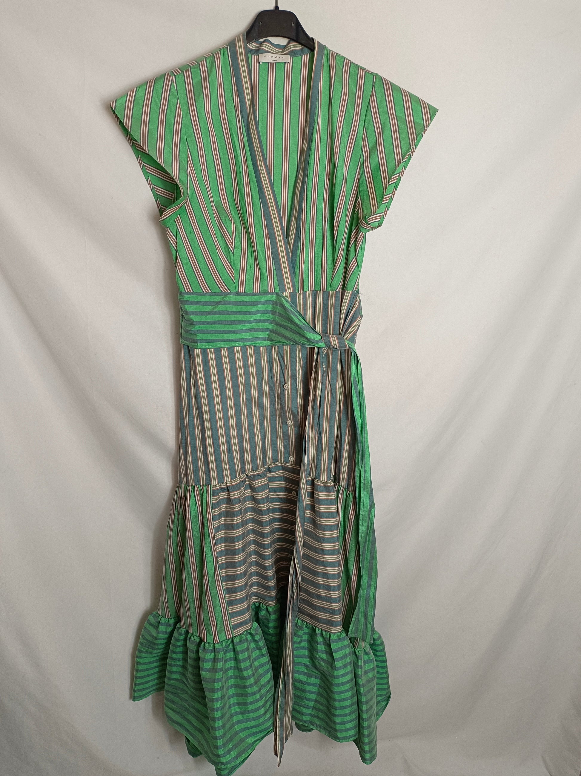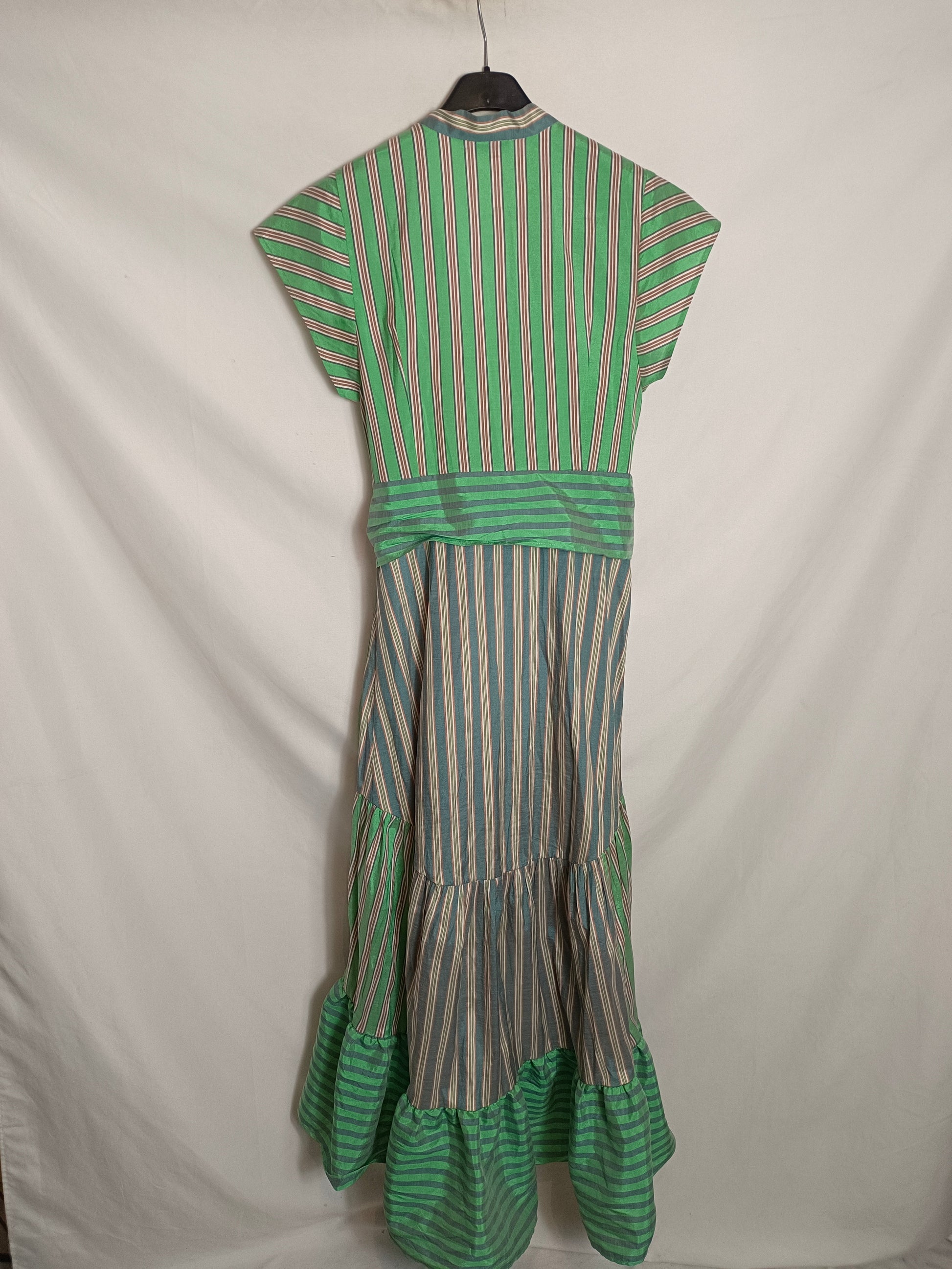 vestido largo de rayas. Tejido brillantes. fluido con cinturón de lazada