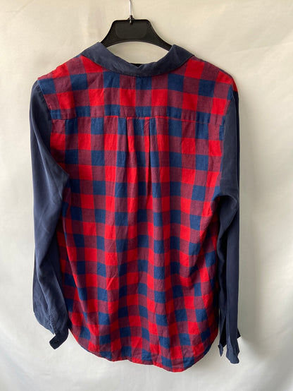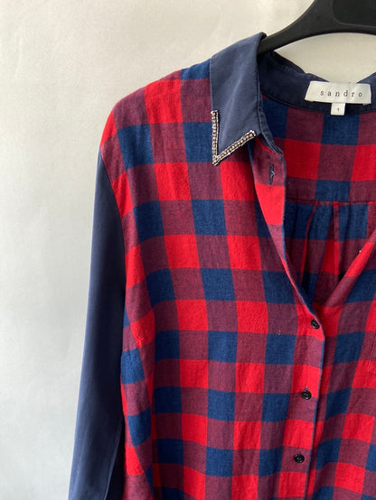 Camisa algodón. Cuadros con mangas y cuello tejido camisa. Detalle de pedrería en los cuello. De sisa a sisa 50 cm largo 73 cm