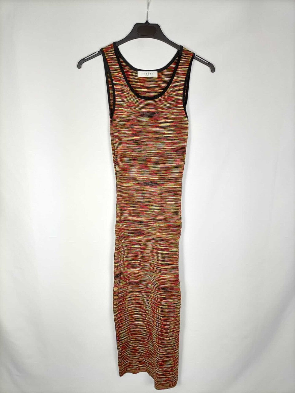 Sandro.xs. vestido midi ajustado de punto con rayas de colores. Elástico. Largo 121.