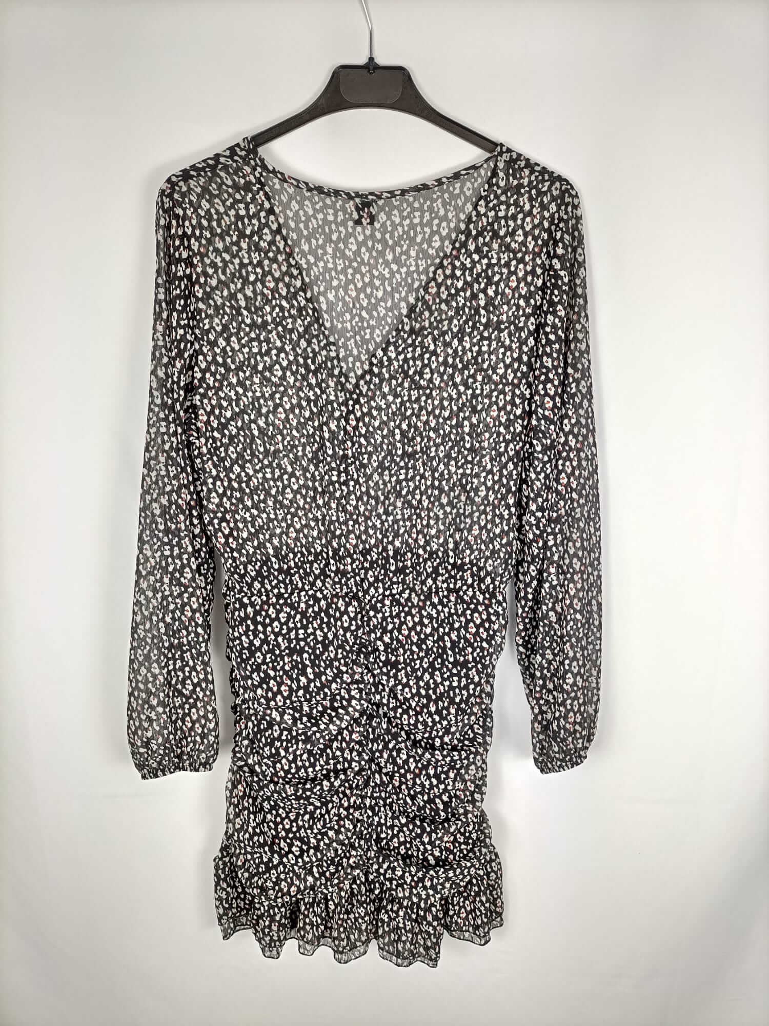 Sarta. Vestido negro de flores con la falda fruncida. Parte de arriba fluida. De sisa a sisa 51 cm largo 58 cm