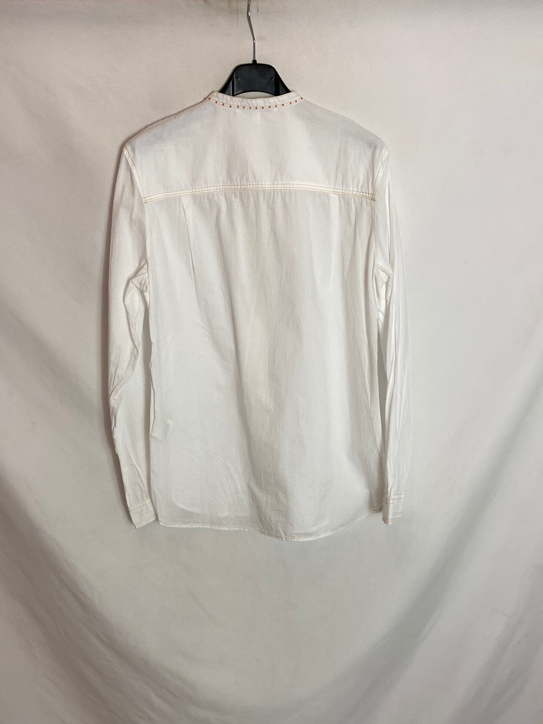 blusa blanca abotonada con detalle de abalorios en tonos teja.