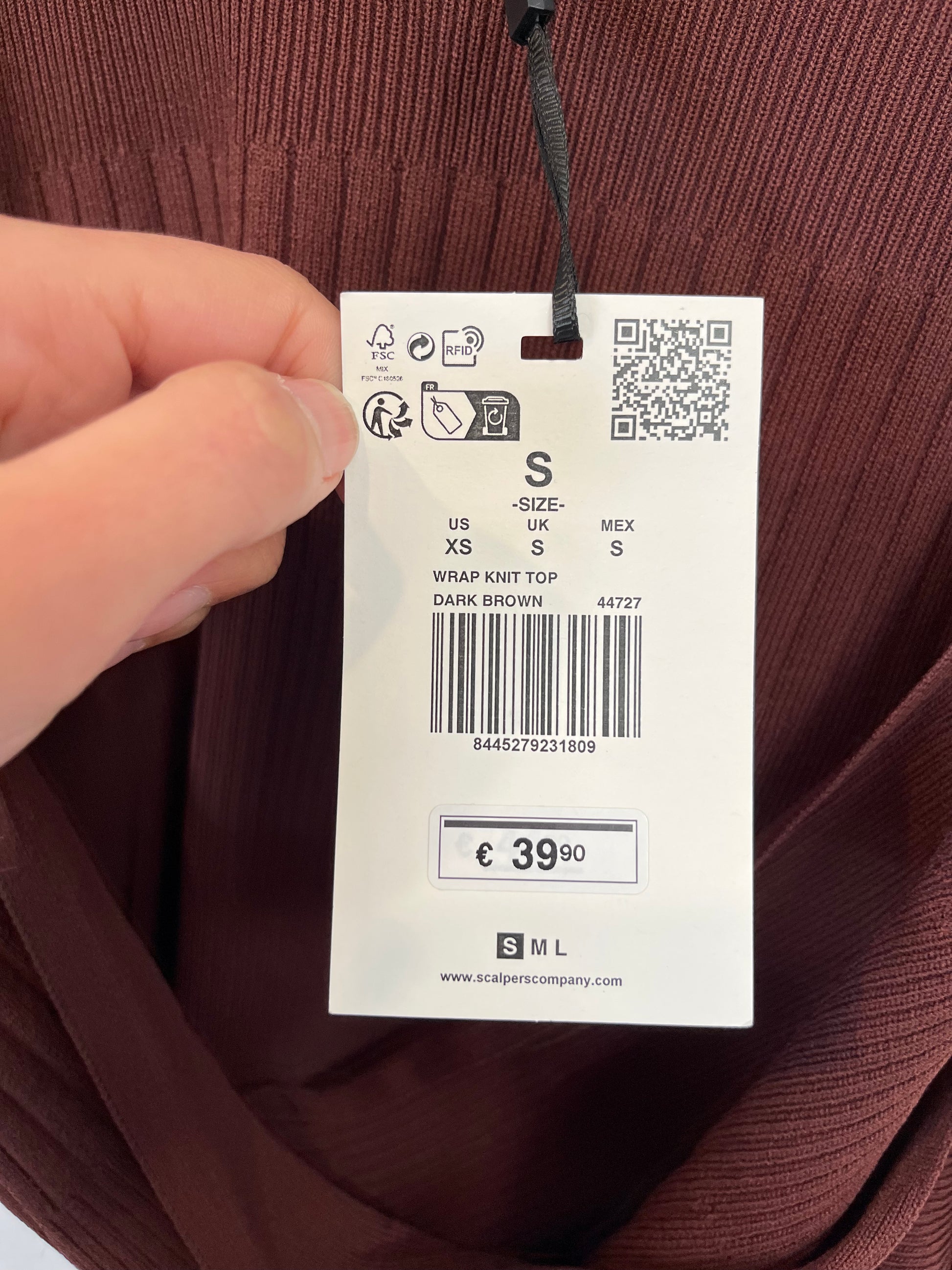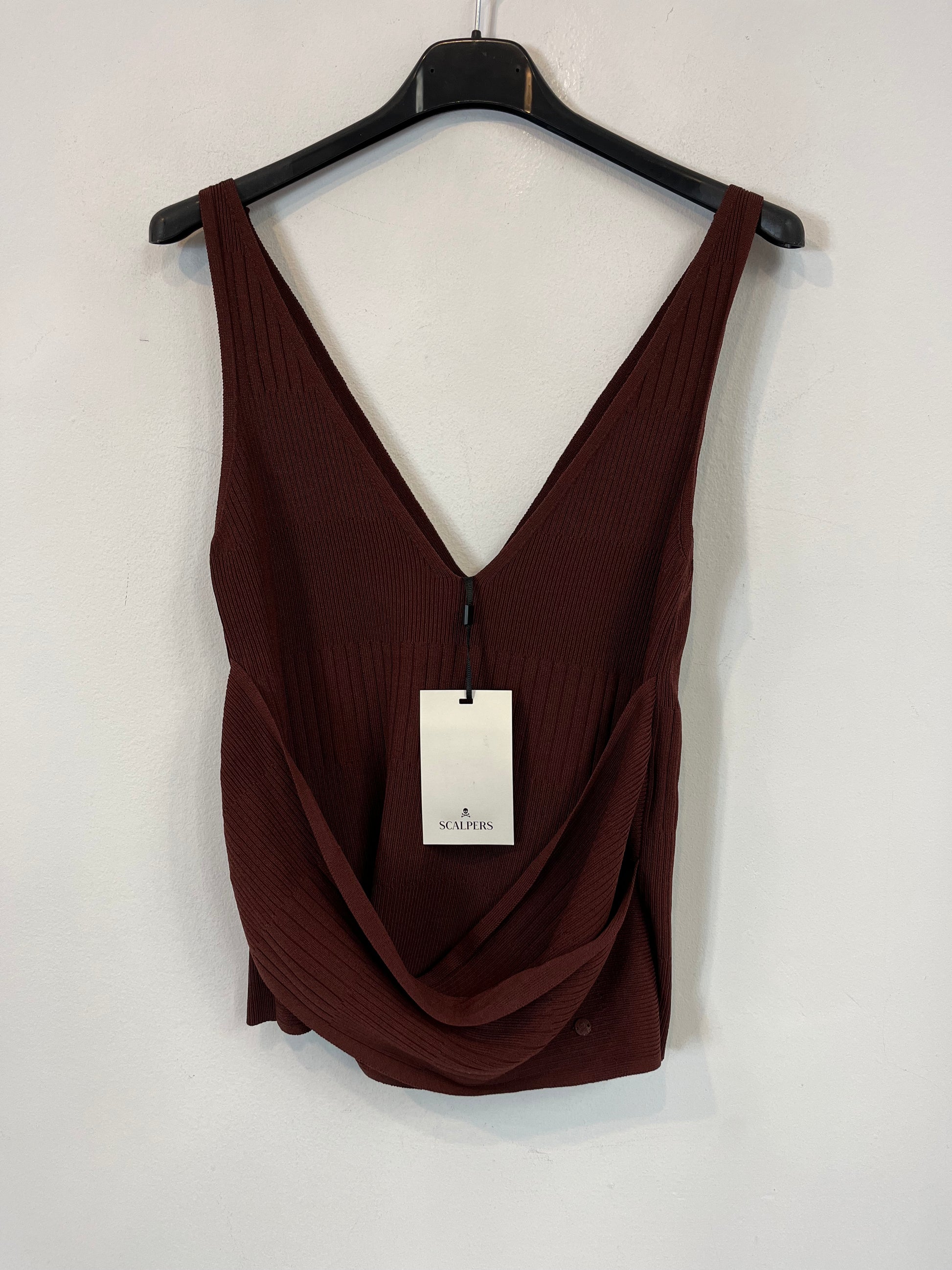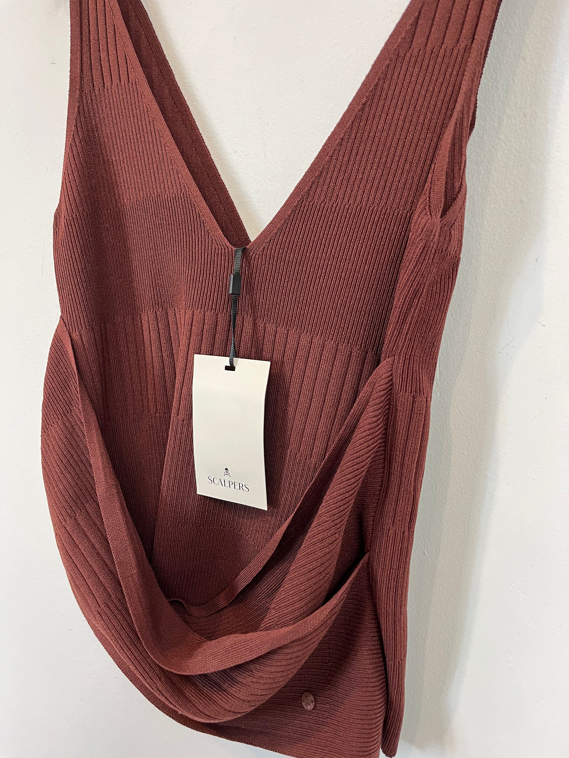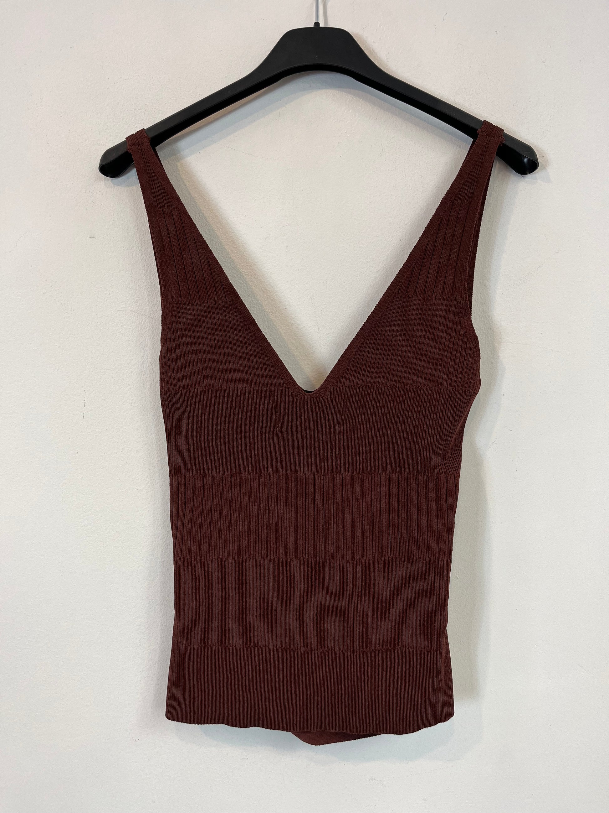 NUEVO CON ETIQUETA. Top marrón de canalé con detalle cruzado. Elástico.